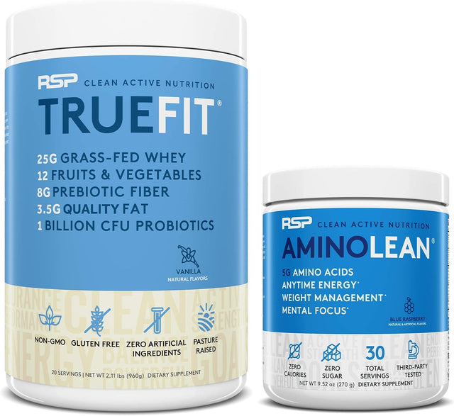 RSP NUTRITION Aminolean Pre Workout Energy (Blue Raspberry 30 Servings) with Truefit Protein Powder (Vanilla 2 LB)