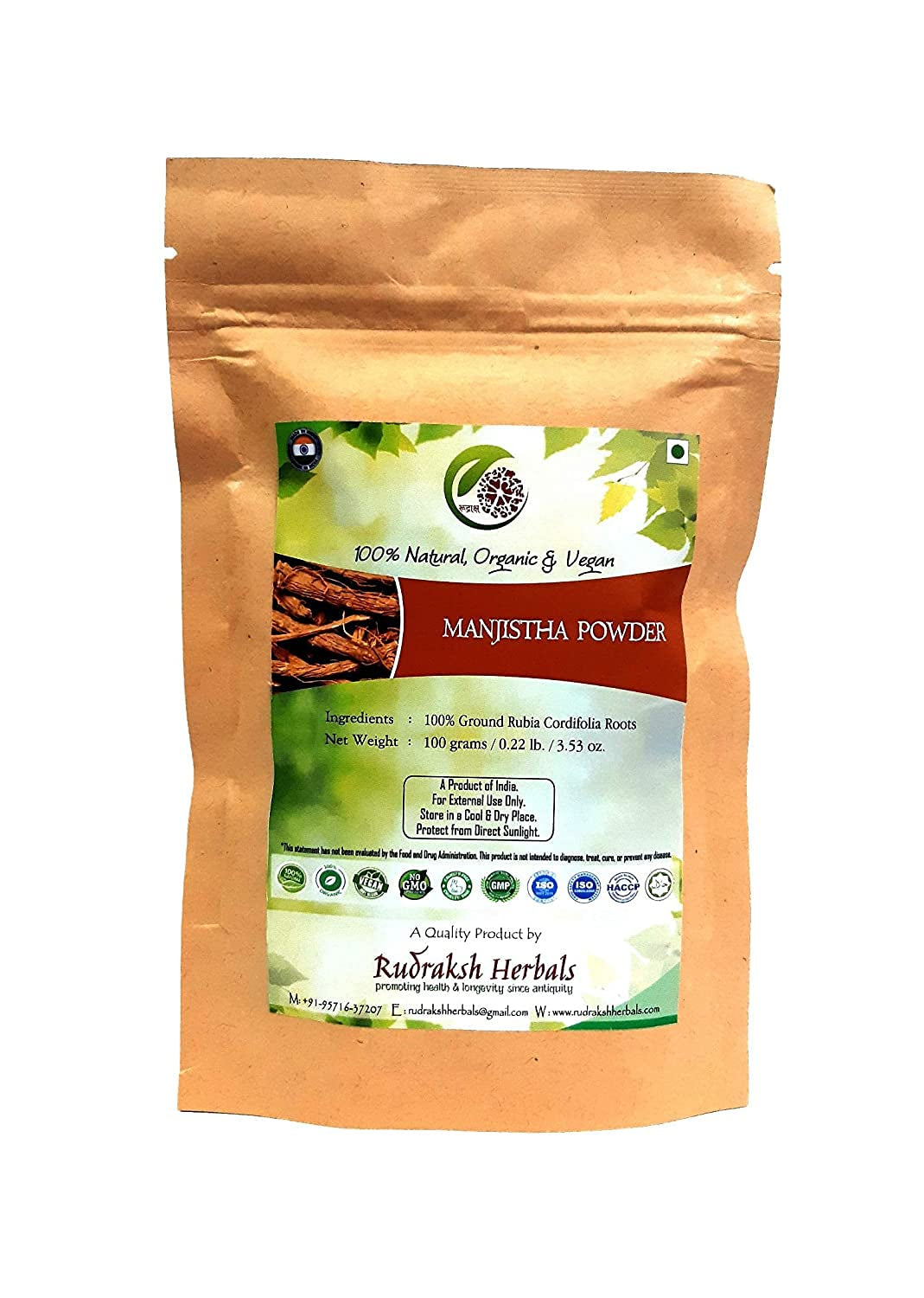 We are pleased to present you our Rudraksh Manjistha POWDER, which is 100% Pure, Authentic, Effective, Natural, Organic, Non-GMO, Vegan and Cruelty-Free. Our entire range of Plant-derived Herbal Cosmetics is formulated with Natural, Organic & Wild-crafted ingredients; no Synthetic Fragrances & Colouring Agents added. All of our products are GMO-, Gluten-, Paraben-, Silicone- & Sulfate-Free! Plus, we use Eco-Friendly & recyclable packaging materials.