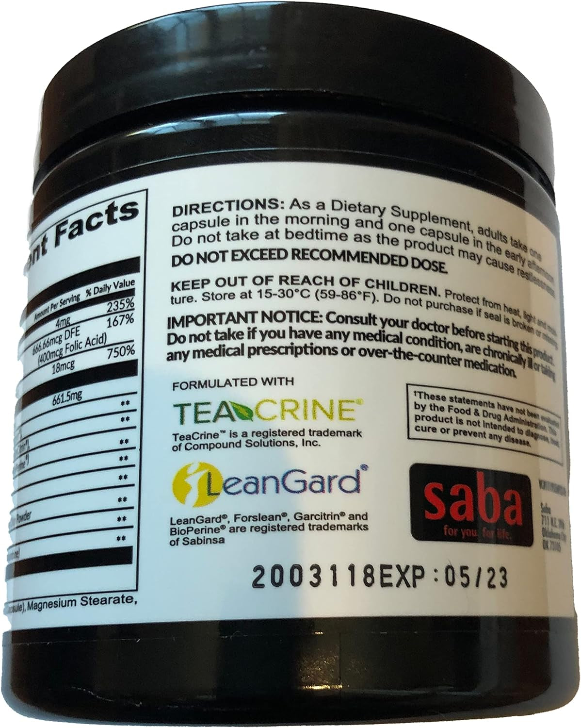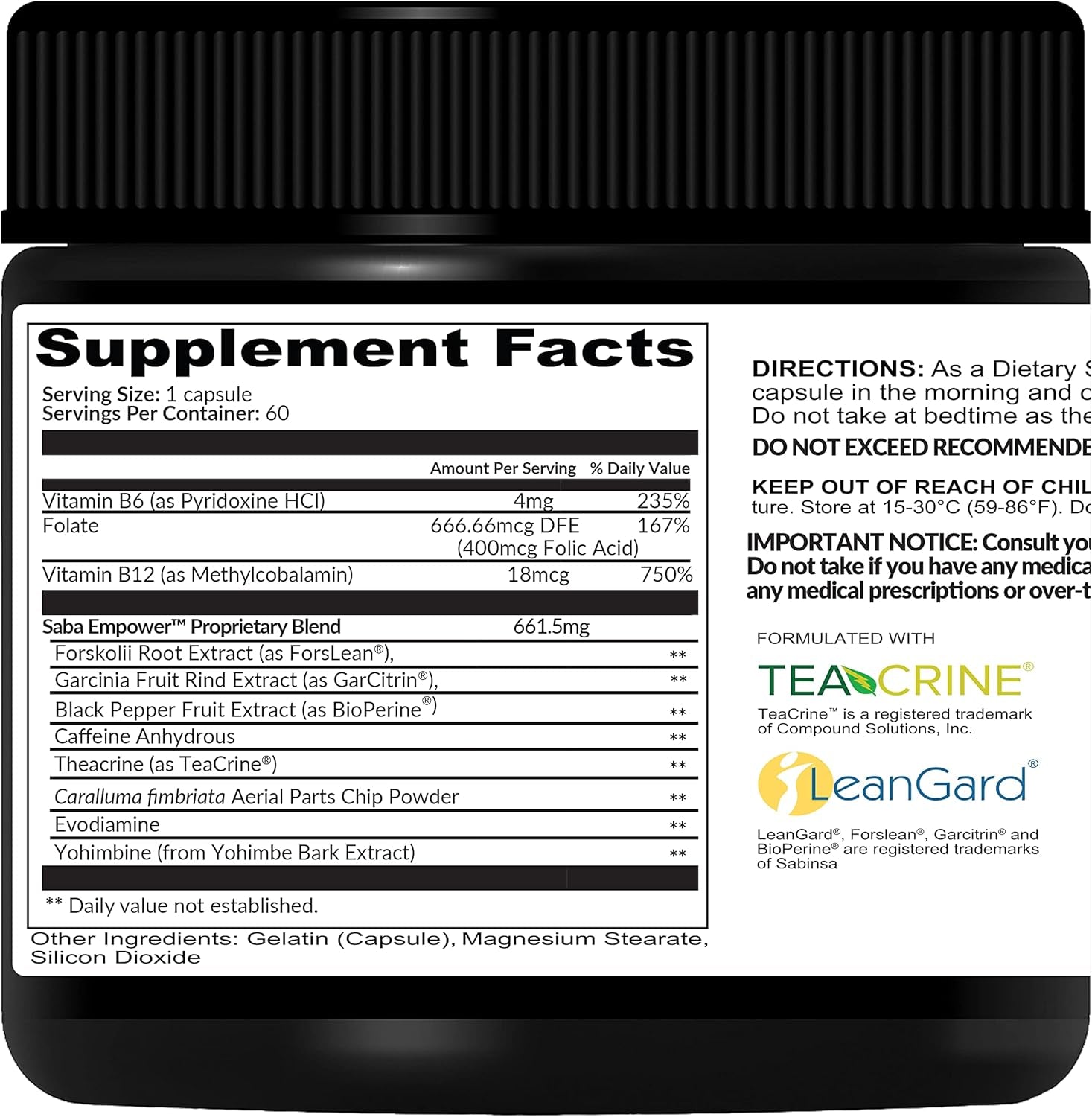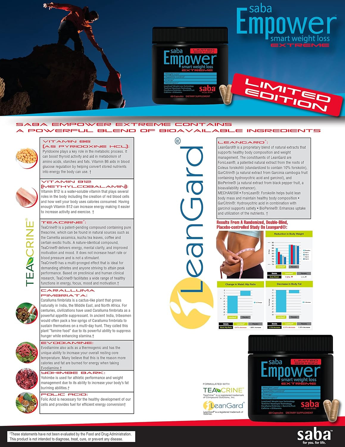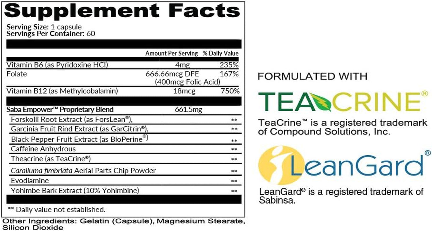 Saba Empower is an effective formula that supports all your energy, appetite control, and proper weight loss needs with patented and researched ingredients. LeanGard weight loss technology, TeaCrine nootropic technology and Caralluma Fimbriata work to help control your hunger while caffeine and B vitamins extend the energy curve. This formula can help you achieve results, so you feel ultra-premium all day long!