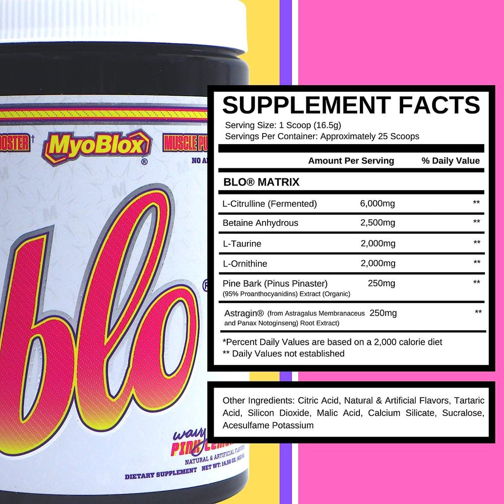 MyoBlox Blo Pre Workout Pump Supplement Wavy Pink Lemonade Flavor is a stimulant free pre workout drink designed to primarily support muscles, strength, energy, and focus during your workout. Add this caffeine free pre workout powder blend to water to transform it into a sensational pink lemonade workout recovery drink! It may also serve as a fully loaded nitric oxide supplement for your healthy pre workout needs! Because this pre workout powder is stimulant free, you don't have to worry about caffeine crashes like with other workout supplements.This is a preworkout for men and women. MyoBlox Blo preworkout powder drink mix includes ingredients researched to maximize muscle pump fullness, cascularity, and strength. These ingredients include l citrulline, betaine anhydrous, l taurine, l ornithine, pine bark extract, and Astragin Root Extract. Other ingredients include citric acid, natural and artificial flavors, tartaric acid, malic acid, silicon dioxide, calcium silicate, sucralose, and acesulfame potassium. Use on training session days only.Mix 1 scoop with approximate 8 oz of cold water and consume 10 minutes prior to training. Do not consume more than the recommended dose! For best results, stack with MyoBlox Loco.These statements have not been evaluated by the Food and Drug Administration. This product is not intended to diagnose, treat, cure, or prevent any disease.