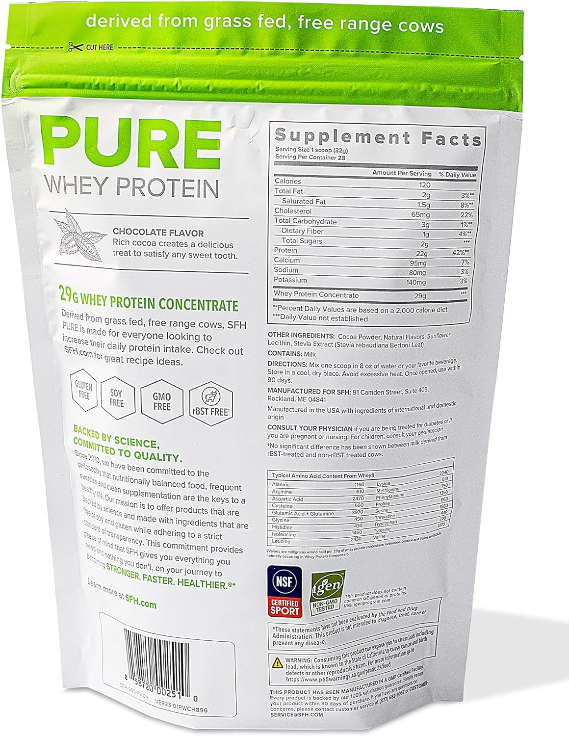 • CLEANEST WHEY ON THE MARKET: SFH PURE Whey Protein is a highly bioavailable (easy to absorb and digest) whey concentrate. An excellent protein choice for all ages, it provides a number of benefits in areas including sports nutrition, weight management, immune support, bone health, and general wellness. Safe for children, pregnant, and nursing. Completely non-GMO and free of soy, gluten, and artificial flavors or sweeteners.