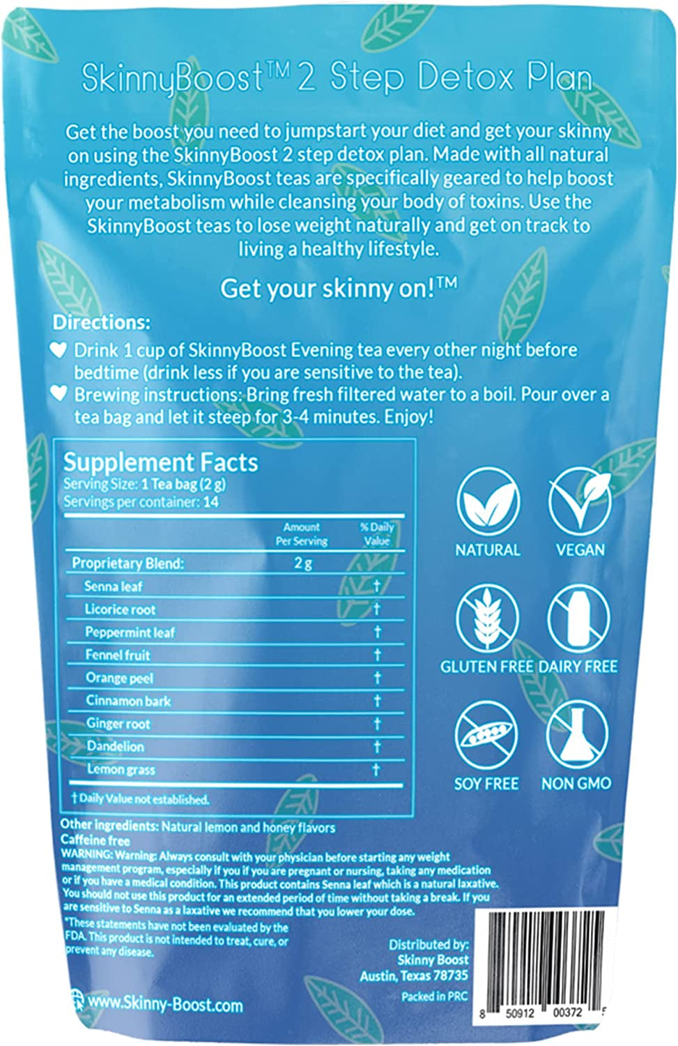 - SUPPORTS A REDUCTION IN BLOATING, IMPROVE DIGESTION- Skinny Boost Evening Tea may help to reduce bloating, get rid of excess water, and improve digestion. It has a gentle colon cleanse effect to help release years of built up toxins which in turn helps to promote wellness. The Evening tea is lemon honey flavored and tastes delicious! Used in conjunction with our DAYTIME TEA, Skinny Boost teas are the ultimate all natural cleanse and detox combination.