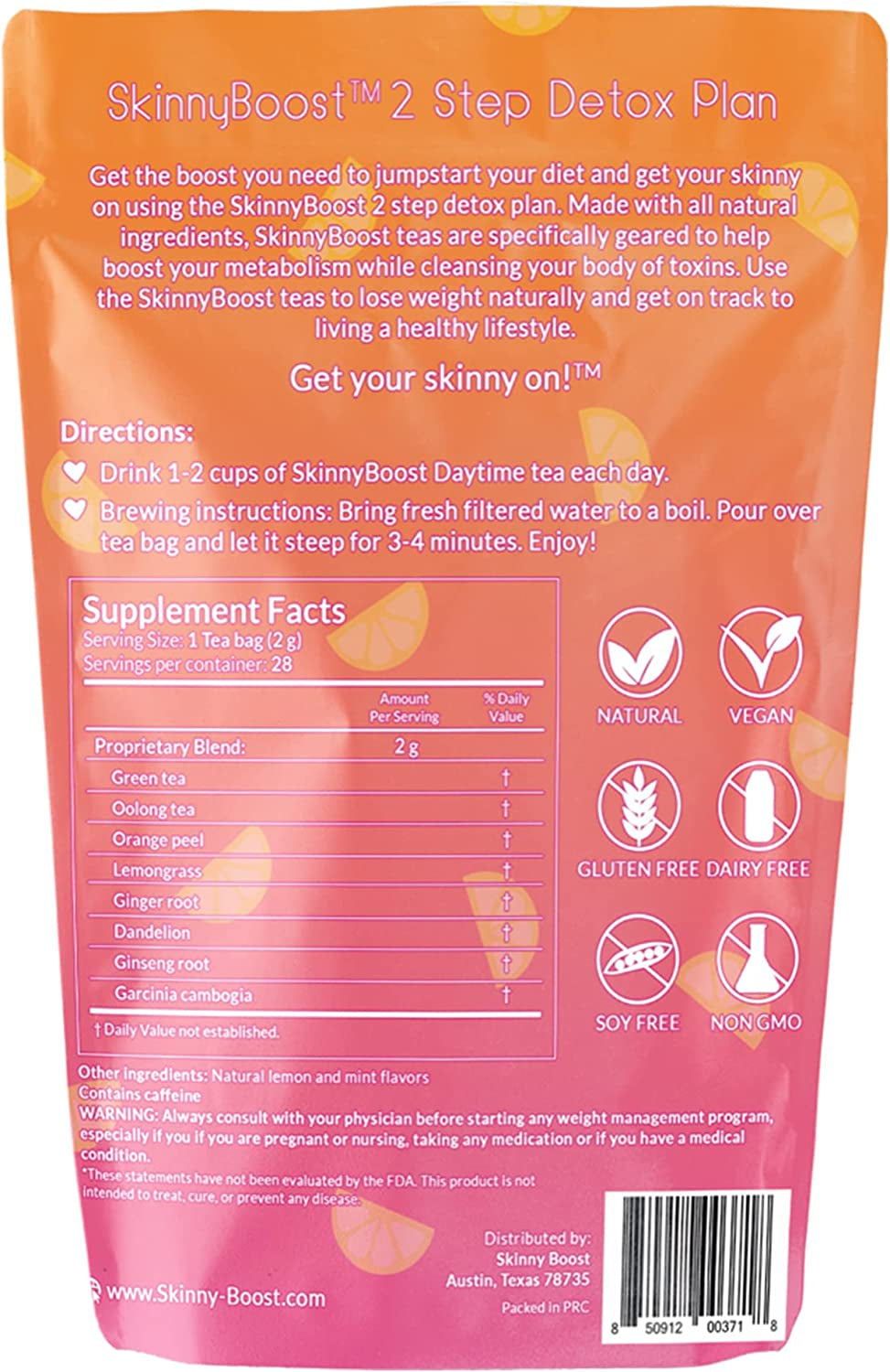 - CLEANSE & DETOX IN 2 STEPS - Skinny Boost 28 Day Detox kit includes 1 Daytime Tea (28 tea bags) and 1 Evening Tea (14 tea bags) Get the boost you need to jumpstart your health and fitness goals using the Skinny Boost 2 step cleanse and detox plan. The combination of our powerful all natural ingredients work together to create a natural cleanse and full body detox which kicks the body in high gear for achieving your wellness goals.