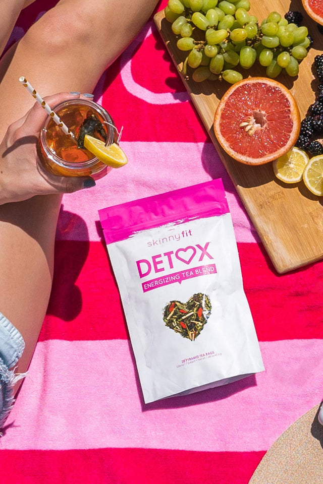 - CALM BLOATING. SkinnyFit is a detox tea that works to help reduce stomach bloating, flush out unwanted toxins, and improve digestion which can help with flattening your tummy!