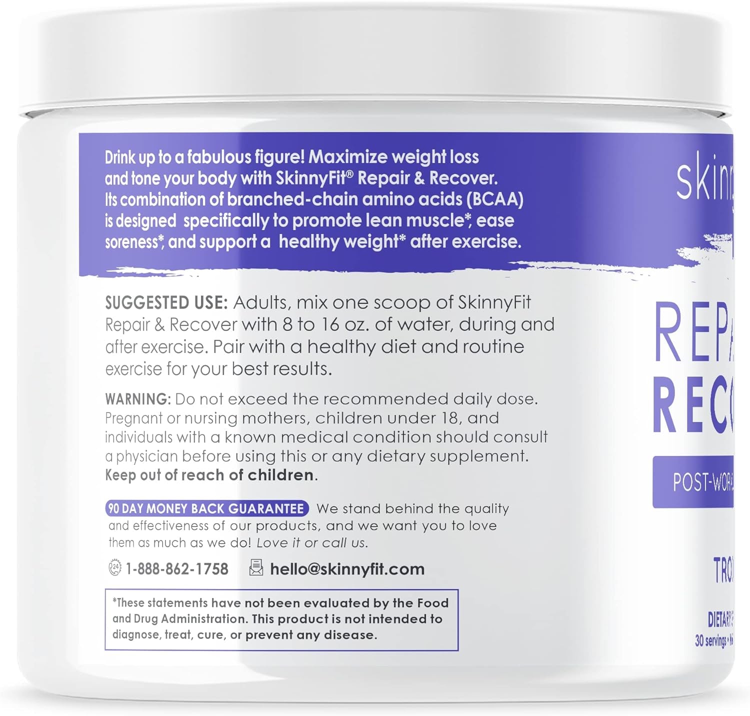 - HELPS PROMOTE MUSCLE GROWTH AND RECOVERY. SkinnyFit Repair & Recover is packed with branched chain amino acids (BCAAs) that help support muscle repair, can promote lean mass, promote natural energy, and help ease muscle soreness.