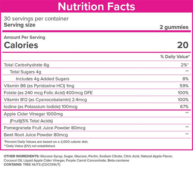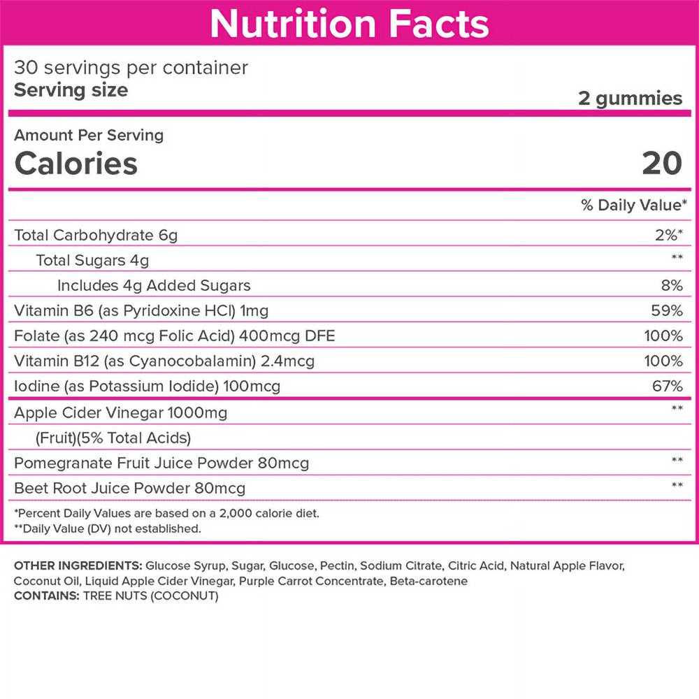 The gummy that gets you to your goals! Our delicious apple cider vinegar gummies in tropical berry flavor skip the sour taste of traditional apple cider vinegar without skipping on its benefits to support weight management, help reduce appetite, and promote glowing skin. Low sugar content is now even lower, with 2g sugar instead of 4g. 30 servings.
