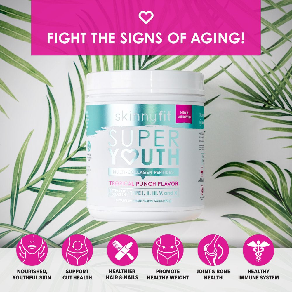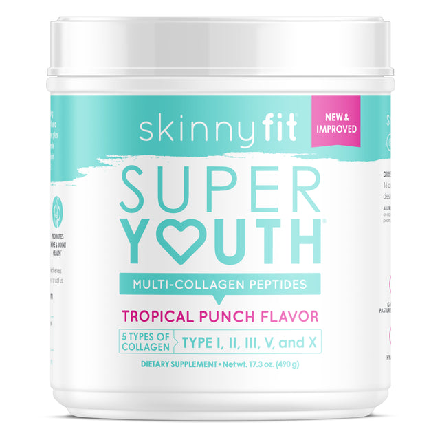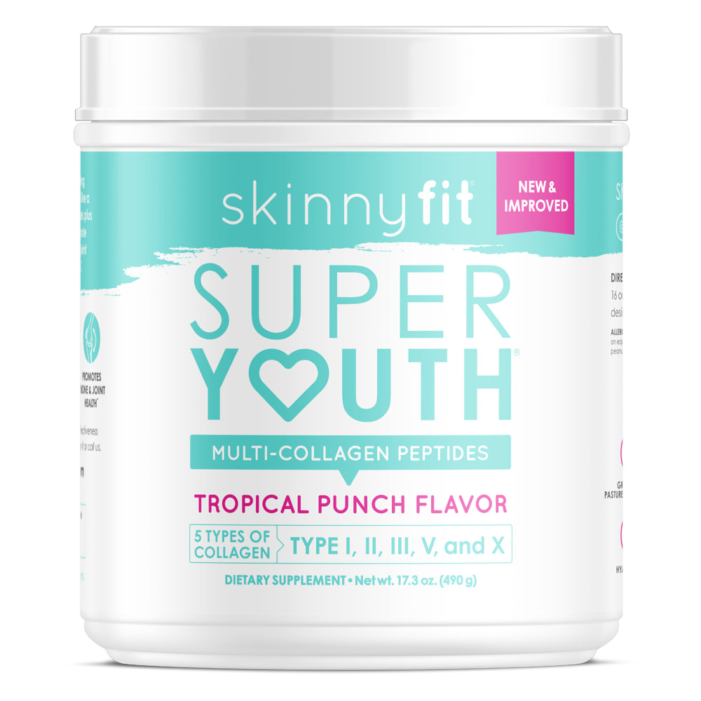 SkinnyFit Super Youth Tropical Punch collagen powder tastes like a vacation with every sip. This premium collagen peptides protein includes 5 major collagen peptides from 4 natural sources plus apple cider vinegar, hyaluronic acid, and vitamin C to restore youthfulness from the inside out. Simply add 2 scoops of Super Youth into any hot or cold flavored drink or food. Mix with your coffee, tea, smoothie or cook with it and enjoy! It also tastes amazing with just water! Super Youth promotes youthful-looking skin, longer hair & nails, reduced joint pain, gut health, and weight loss. From your skin to your joints, you’ll notice the difference as you make Super Youth a daily routine. About 28 servings in each container.