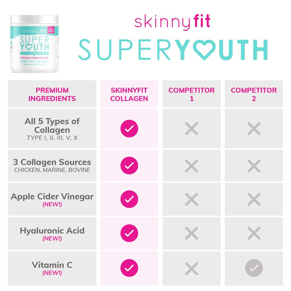 • OUR PREMIUM COLLAGEN BLEND TASTES BETTER THAN EVER. Super Youth Tropical Punch contains 5 of the healthiest types of hydrolyzed collagen peptides plus apple cider vinegar, hyaluronic acid, and vitamin C. It’s gluten-free, non-gmo, and has a refreshing fruity flavor you’ll love. Super Youth Tropical Punch is so delicious and dissolves so easily, it can be mixed with water alone!