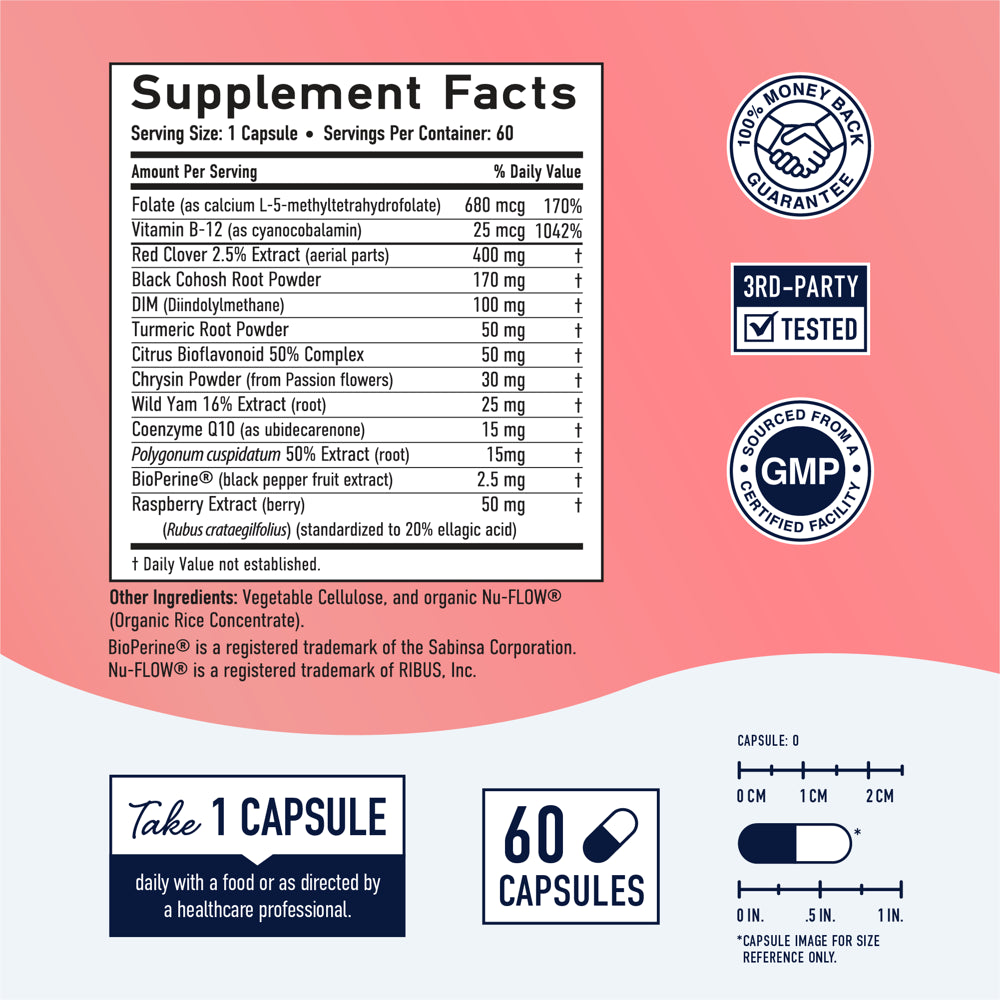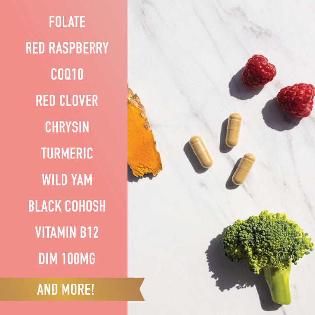 As the DIM supplement leader, we had to include it alongside the herbal ingredients that make up our menopause complex. Every capsule contains: DIM 100mg, Folate, Vitamin B12, Black Cohosh, CoQ10, Turmeric, BioPerine, Citrus Bioflavonoid, Wild Yam, Red Clover, Red Raspberry (Ellagic Acid), Chrysin, and Resveratrol.Made For Women: