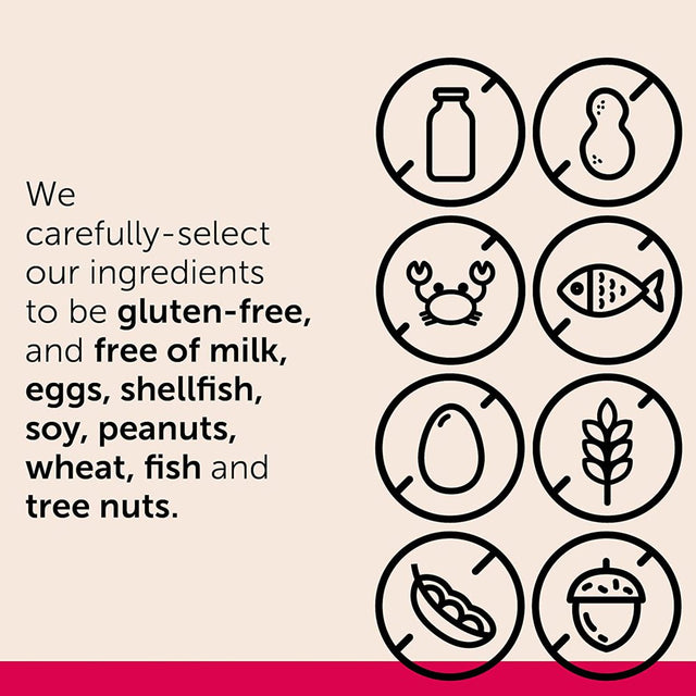 - Free of milk, eggs, shellfish, soy, peanuts, wheat, fish and tree nuts.