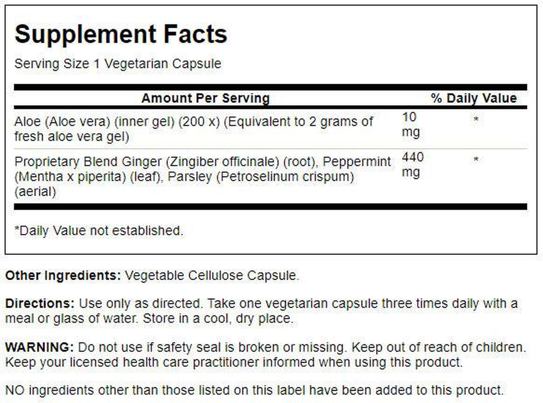 Solaray Aloe Vera Gel Concentrate contains the whole inner leaf, making sure you get all the nutrients contained in the plant. Each VegCap contains the equivalent to 2000 mg of fresh aloe vera gel. Ginger, peppermint, and parsley have also been added for additional support of the digestive system.