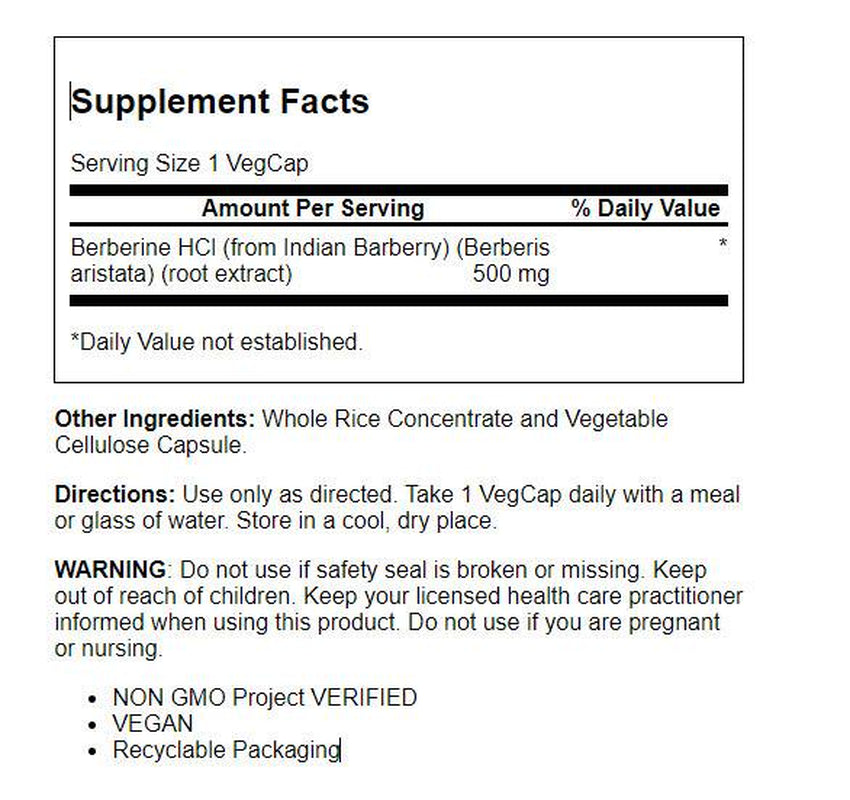 Berberine 500 mg is vegan, and like all Solaray products, is lab verified for the potency and purity of its ingredients. Confidence in the Solaray name is just one of the reasons we’ve been around so long and maintain our place as a leader in the industry. Unlike many other companies, we manufacture almost all our own products, which gives us the ability to thoroughly test and screen raw ingredients for the slightest amount of impurities and manage the production process to provide the best possible quality. Rest assured, only the purest formulas ever reach your cabinet. And because we are always committed to leaving the world a little better than we found it, we now package this product in 100% post consumer recycled plastic bottles.