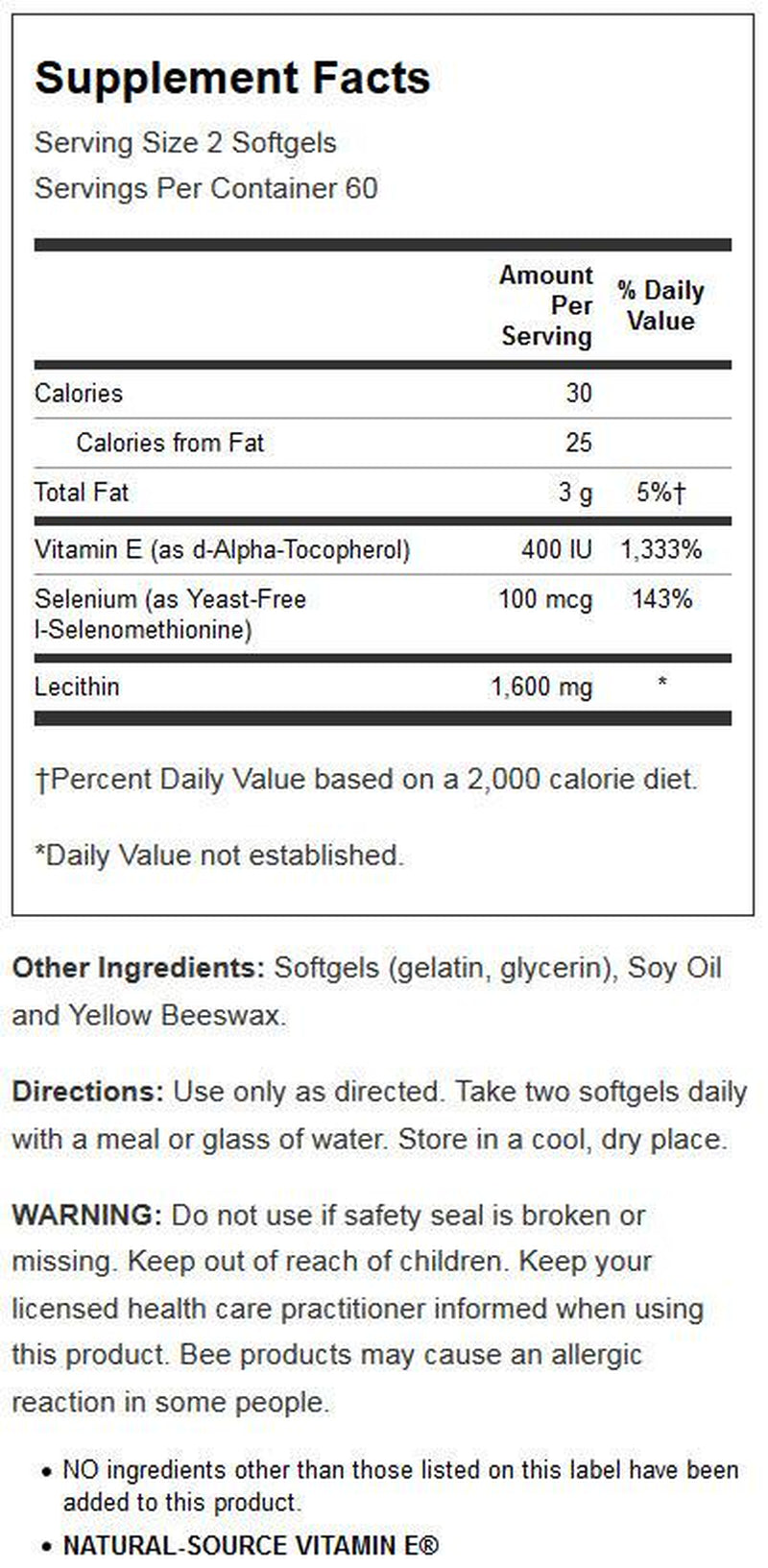 Solaray Bio Vitamin E 400 IU Softgels with Selenium is a high-potency Vitamin E antioxidant supplement. Just two softgels daily provides 268 mcg or 400 IU of Vit E – that's 1,787% DV of this essential vitamin. Vitamin E with tocopherols like our Bio Vitamin E derived exclusively from 100% natural, unesterified d-Alpha-Tocopherol may help support healthy skin and cardiac function. A powerful antioxidants supplement, we combine Lecithin 1,600 mg and Selenium 100 mcg to help facilitate absorption and create a unique and powerful antioxidant combination. Like all Solaray products, Bio Vitamin E with Selenium is lab verified for potency, purity, and identity. Confidence in the Solaray name is just one of the reasons we’ve been around so long and maintain our place as a leader in the industry. Unlike many other companies, we manufacture almost all our own products in our GMP-certified facility and thoroughly test and screen raw ingredients in our state-of-the-art in-house lab for the slightest amount of impurities. This allows us to manage the production process from beginning to end so we can provide the best possible quality. Rest assured, only the purest formulas ever reach your cabinet. And because we are always committed to leaving the world a little better than we found it, we now package this product in 100% post consumer recycled plastic bottles.