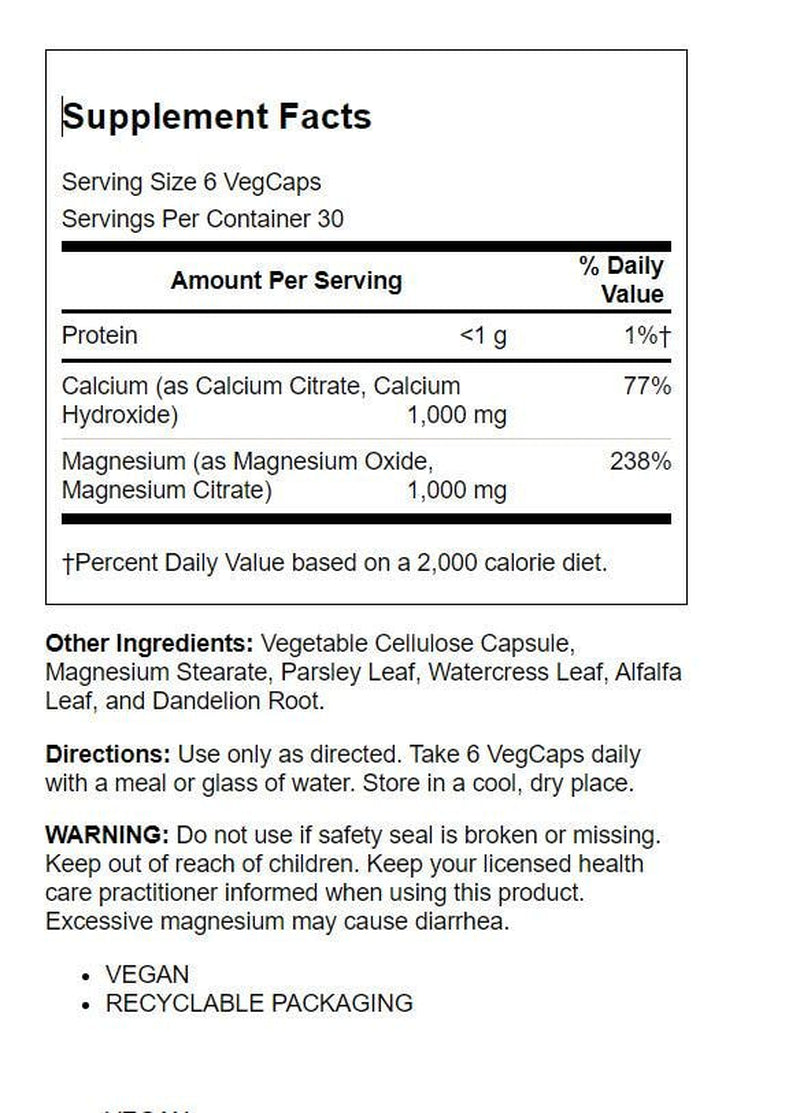 Calcium (as Calcium Citrate, Calcium Hydroxide), Magnesium (as Magnesium Oxide, Magnesium Citrate); Other Ingredients: Vegetable Cellulose Capsule, Magnesium Stearate, Parsley Leaf, Watercress Leaf, Alfalfa Leaf and Dandelion Root./div>