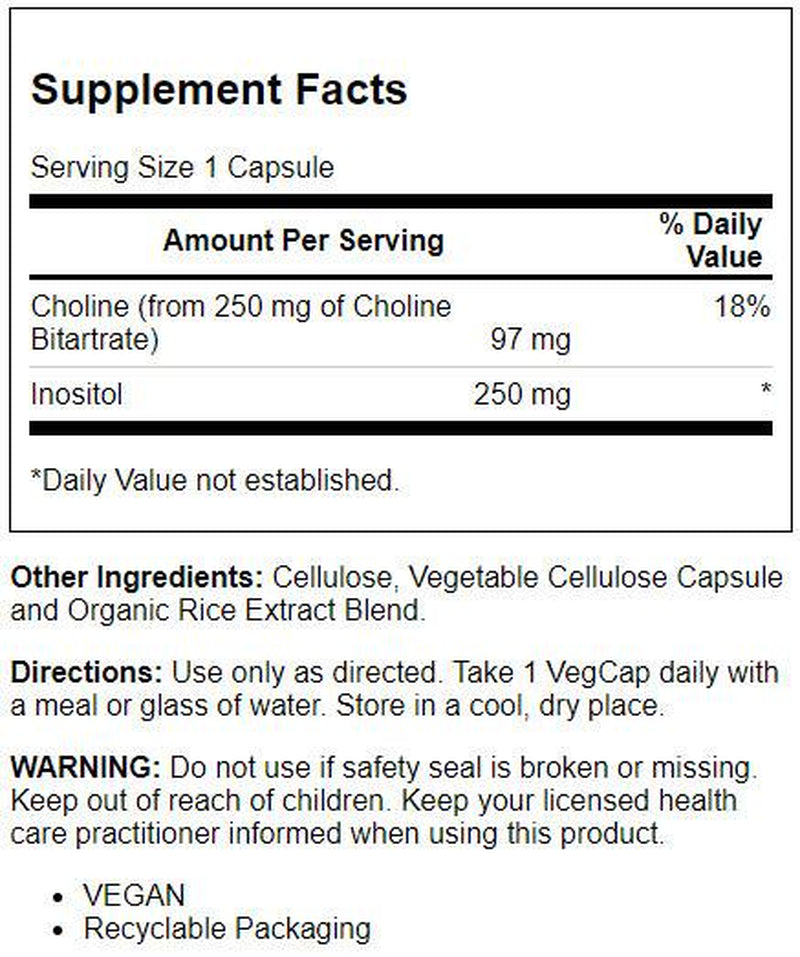 Solaray Choline & Inositol provides 97 mg of choline and 250 mg of inositol in each 1-VegCap serving.
