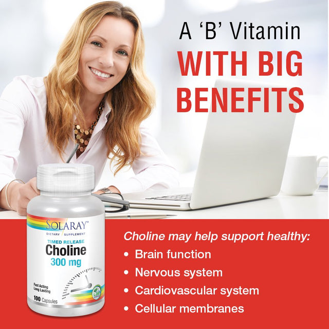 Solaray Choline, Two-Stage Timed-Release 300Mg | B Vitamin for Healthy Brain Function & Cardiovascular Support | Non-Gmo | 100 Capsules