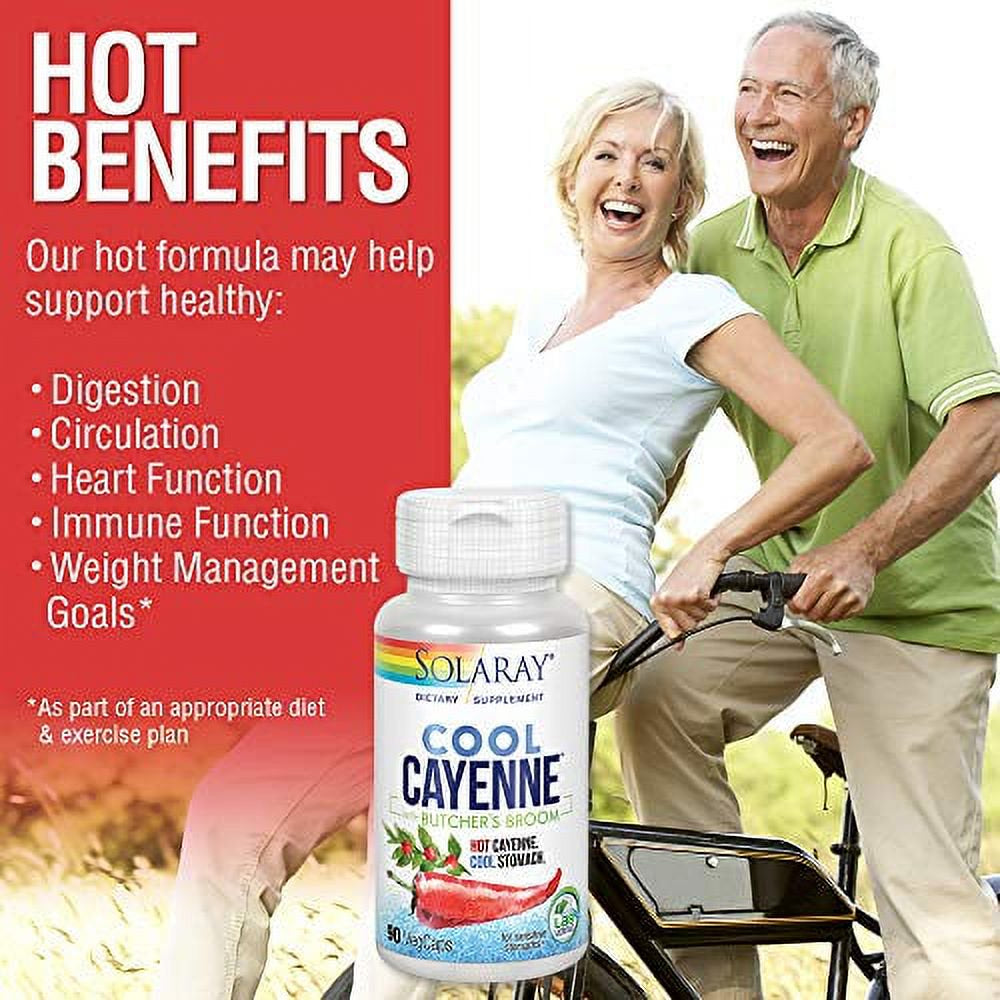 Solaray Cool Cayenne Pepper provides 40,000 heat-unit cayenne that has completed our Bio-Cool process – a proprietary method for keeping cayenne in its spicy-hot form without burning your stomach! Committed to bringing you quality supplements, we’ve also added butcher’s broom that may help support healthy circulation.