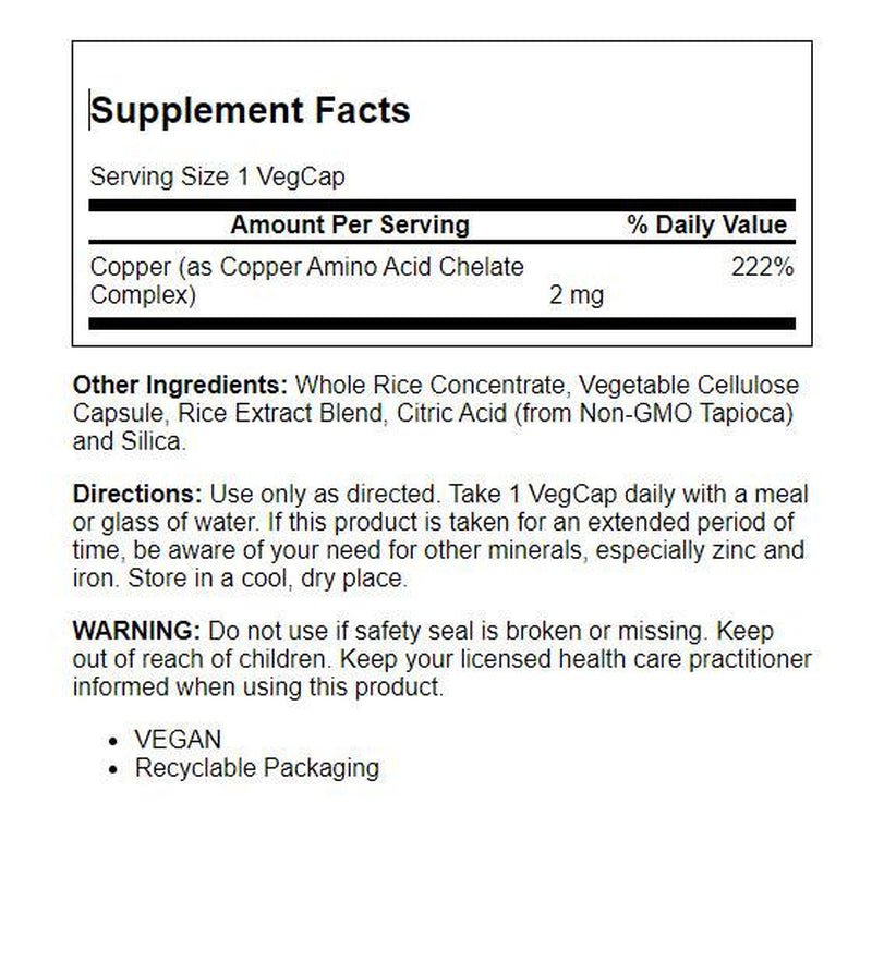 Committed to crafting superior products that just work better, we bring you Solaray Copper 2 mg. This hardworking supplement provides 222% of the daily value in a bioavailable amino acid chelate form. Minerals in this formula are reacted with aspartic acid, whole rice concentrate, citric acid and glycine for faster absorption and utilization.