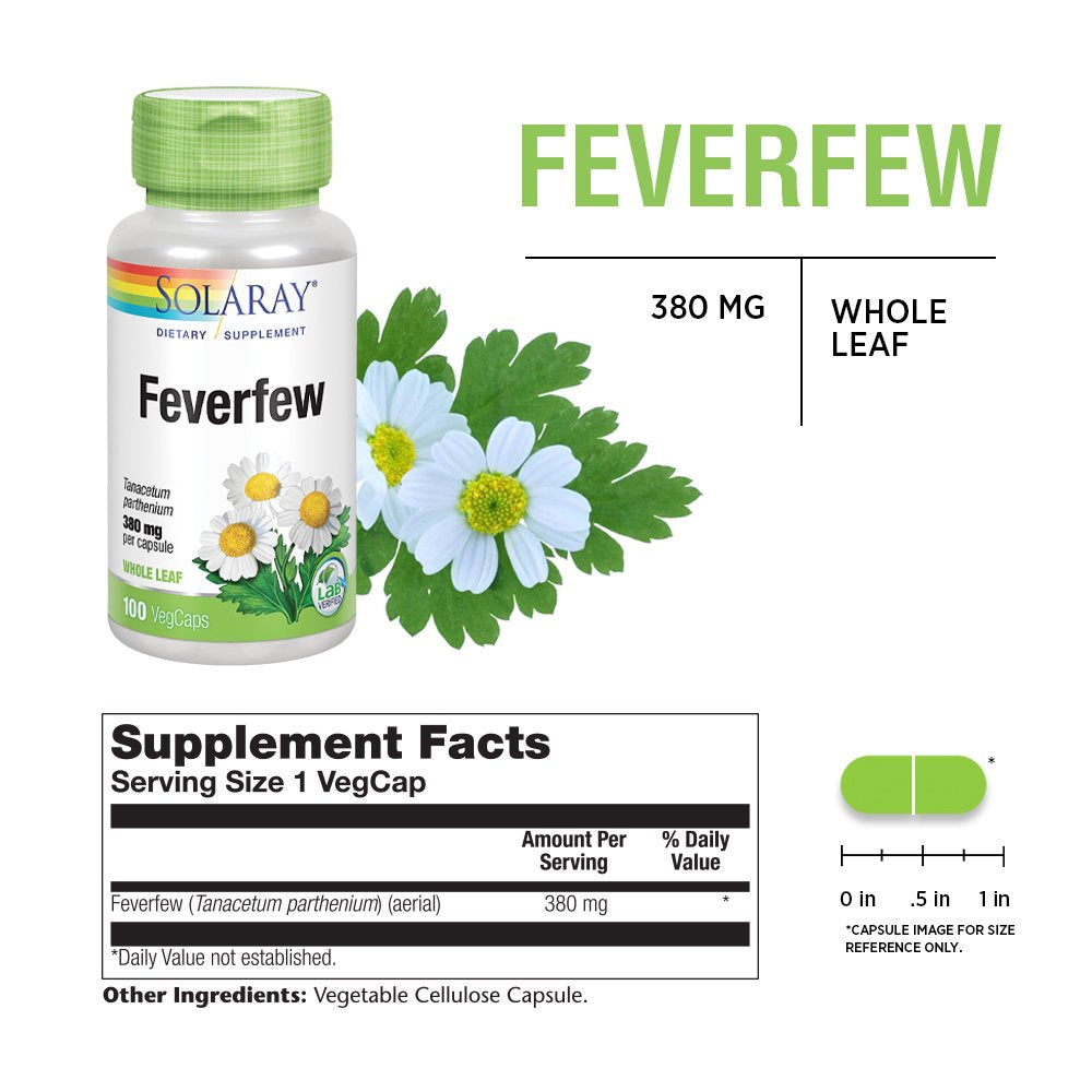 Solaray Feverfew Leaf 380 Mg | Healthy Circulation, Blood Vessel Tone, Comfort Support | Non-Gmo & Vegan | 100 Vegcaps