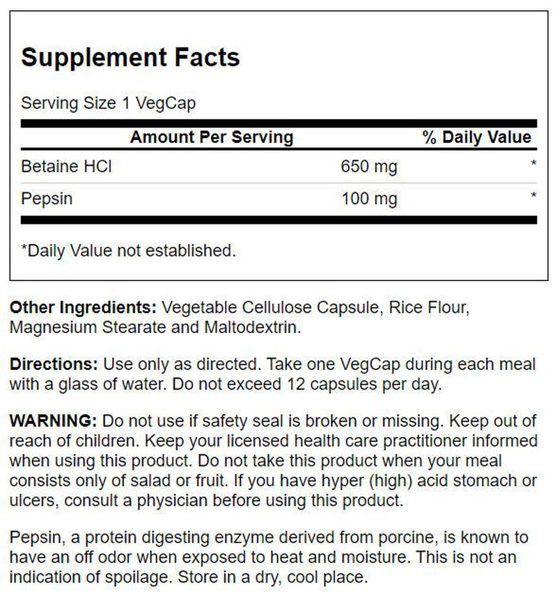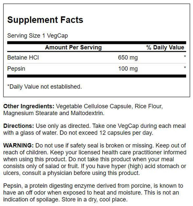 Solaray High Potency Betaine HCL with Pepsin provides 650 mg of betaine HCL, which may help support the bodyÃs own production of hydrochloric acid. Our gut health formula also supplies 162 mg of pepsin, a key digestive enzyme that may help the body break down proteins, amino acids and vitamins to help support proper digestion and stomach comfort.