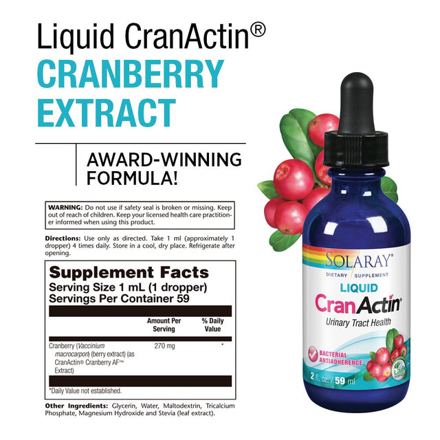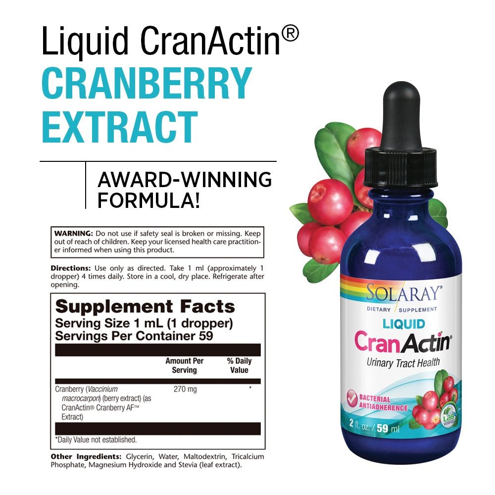 While cranberries may make a delicious topping for turkey or yogurt, theyre also a source of powerful health nutrients! An award-winning formula, Solaray Liquid CranActin Cranberry Extract packs the power of cranberries into a convenient supplement intended to help support urinary tract and bladder health.