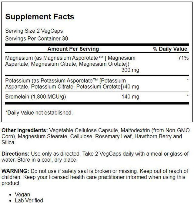 Two of the most common minerals found within the body, magnesium and potassium provide essential support to hundreds of biochemical reactions. While eating a balanced diet is always preferred, when it comes to these two essential minerals, it may not be enough. In fact, some studies show that most American diets are not meeting recommended daily amounts of either magnesium or potassium. That’s why we offer a powerful 1-2 punch with our magnesium and potassium supplement, Magnesium & Potassium Asporotates with Bromelain. While magnesium helps support everything from healthy muscle and cardiovascular function to relaxation, rest, and stress tolerance, potassium provides complementary support for healthy muscle function. Together, magnesium potassium supplements can work to support healthy electrolyte balance. To enhance bioavailability, our potassium magnesium supplement combines the minerals with aspartic, orotic, and citric acids for a chelated combination. Ultimately, you won't find potassium and magnesium supplements that equal Solaray. Like all Solaray products, Magnesium Potassium Asporotates is lab verified for potency, purity, and identity. Confidence in the Solaray name is just one of the reasons we’ve been around so long and maintain our place as a leader in the industry. Unlike many other companies, we manufacture almost all our own products in our GMP-certified facility and thoroughly test and screen raw ingredients in our state-of-the-art in-house lab for the slightest amount of impurities. And because we are always committed to leaving the world a little better than we found it, we now package this product in 100% post consumer recycled plastic bottles.