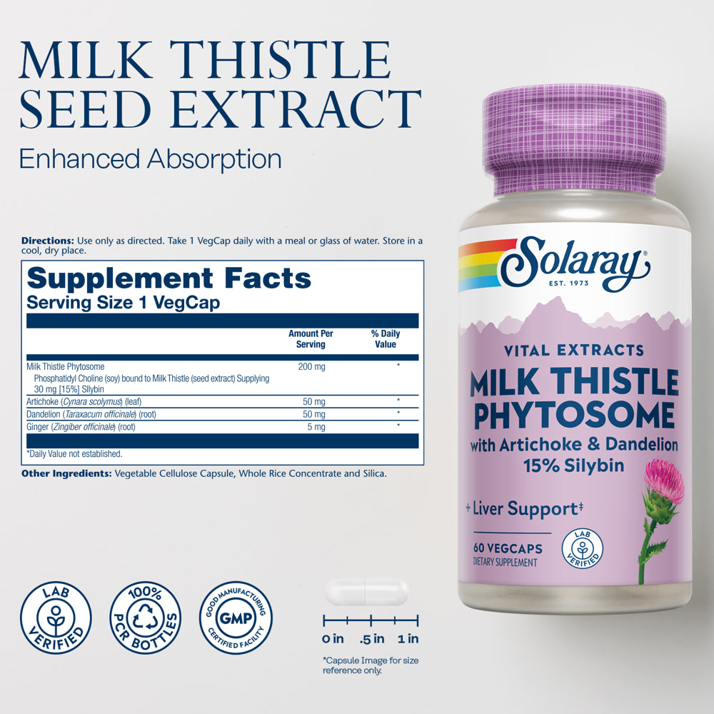 Native to the Mediterranean region, milk thistle has been used traditionally for more than 3,000 years and is still considered today to be one of the best liver cleanse and liver detox tonics in the world. In addition to acting as a liver detox cleanse herb, milk thistle may also act as a kidney cleanse ingredient and powerful antioxidant that helps protect the human body from free radical damage. Intended to be among the best liver detox supplements, each capsule of Solaray Milk Thistle Seed Extract is guaranteed to contain 30 mg [15%] of silybin, the major key constituent of milk thistle liver detox products. Our unique, powerful liver pills are made by binding phosphatidylcholine with milk thistle seed extract for enhanced absorption and include artichoke, dandelion, and ginger for added support. This milk-thistle formula is great for those seeking cardo mariano para el higado graso, liver complex para el higado graso y inflamado, and silimarina para el higado graso. Like all Solaray products, Milk Thistle Phytosome is lab verified for potency, purity, and identity. Confidence in the Solaray name is just one of the reasons we’ve been around so long and maintain our place as a leader in the industry. Unlike many other companies, we manufacture almost all our own products in our GMP-certified facility and thoroughly test and screen raw ingredients in our state-of-the-art in-house lab for the slightest amount of impurities. This allows us to manage the production process from beginning to end so we can provide the best possible quality. Rest assured, only the purest formulas ever reach your cabinet. And because we are always committed to leaving the world a little better than we found it, we package this product in 100% post consumer recycled plastic bottles.