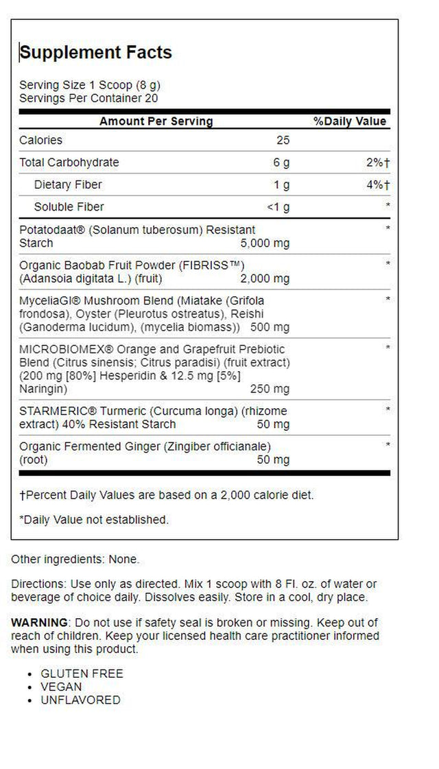 - Unflavored Prebiotic Supplement - Our vegan and gluten free prebiotics for men and women are non gritty, dissolve easily in any beverage of choice, and contain no added sugars or flavors.