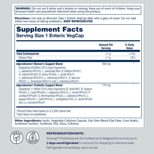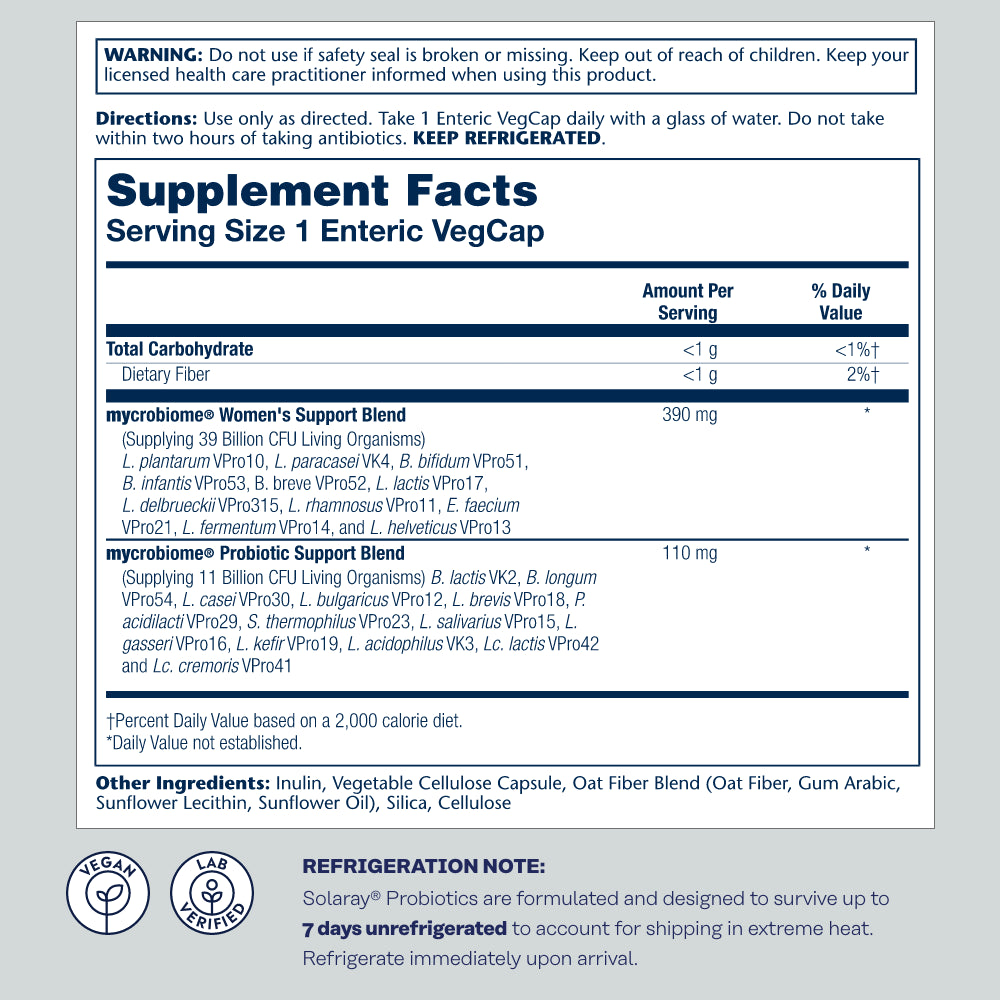 Solaray Mycrobiome Probiotic Womens Formula | Specially Formulated for Women | Digestion, Mood & Urinary Tract Support | 50 Billion CFU | 30 Vegcaps is backordered and will ship as soon as it is back in stock.