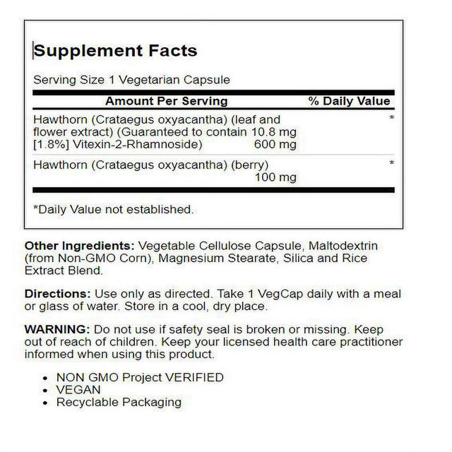 One Daily Hawthorn Extract 600 mg from Solaray helps you look after your heart health without having to remember to take multiple doses.The leaves, flowers, and berries of hawthorn contain a variety of bioflavonoids.