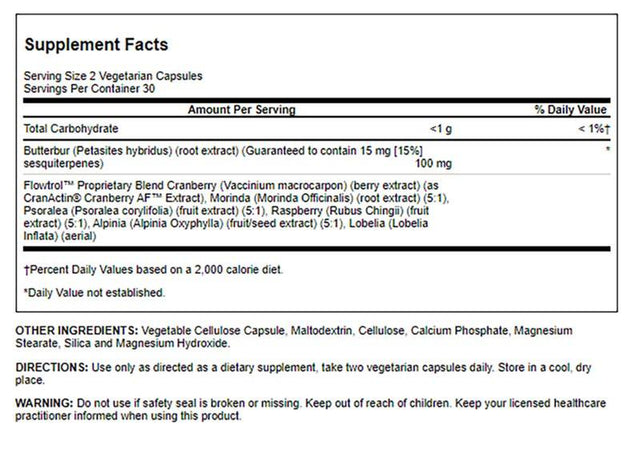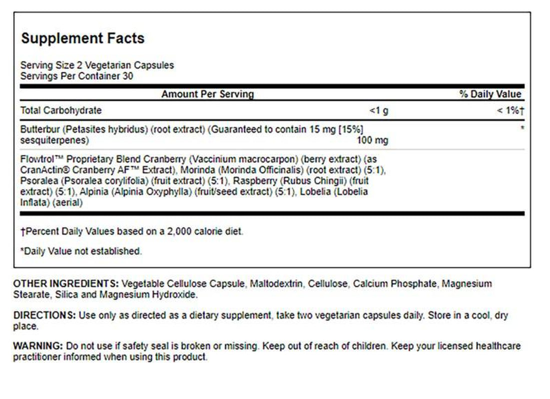 Original Continence with Flowtrol(TM) by Solaray is designed to deliver optimal bladder support. This unique formula features butterbur, an herb known for promoting healthy bladder function. Also included is a proprietary blend of beneficial herbal ingredients, including cranberry, morinda and raspberry extracts.