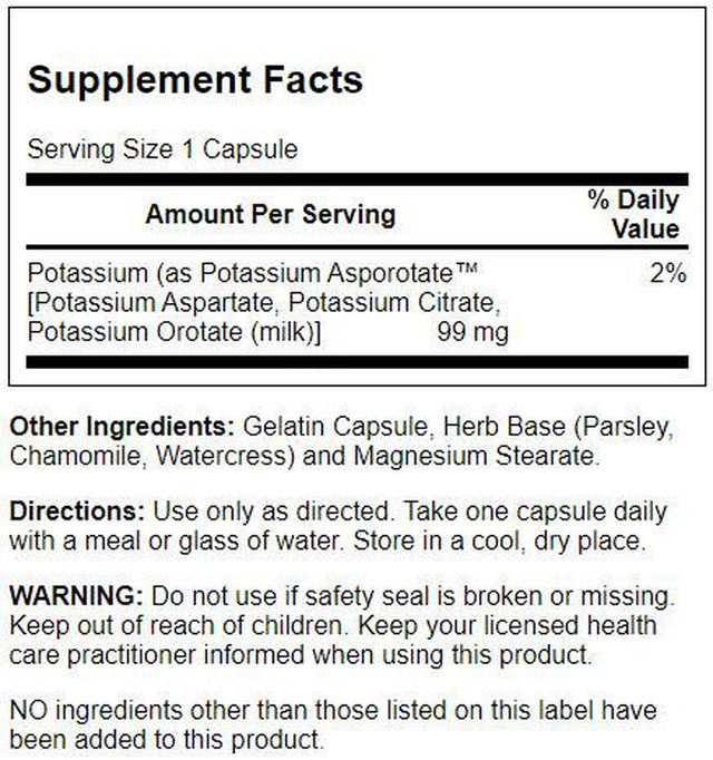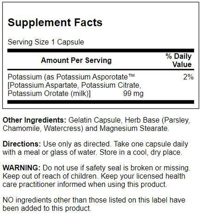 Solaray Potassium Asporotate is a highly advanced potassium formula that features potassium and other components producing a natural chelation process resulting in the formation of a special complex that delivers potassium aspartate, potassium citrate, and potassium orotate. Each capsule delivers 99 mg of potassium.