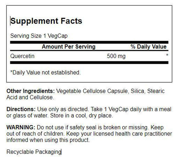 Quercetin 500 mg is vegan, and like all Solaray products, is lab verified for potency and purity. Confidence in the Solaray name is just one of the reasons we’ve been around so long and maintain our place as a leader in the industry. Unlike many other companies, we manufacture almost all our own products, which gives us the ability to thoroughly test and screen raw ingredients for the slightest amount of impurities and manage the production process to provide the best possible quality. Rest assured, only the purest formulas ever reach your cabinet. And because we are always committed to leaving the world a little better than we found it, we now package this product in 100% post consumer recycled plastic bottles.