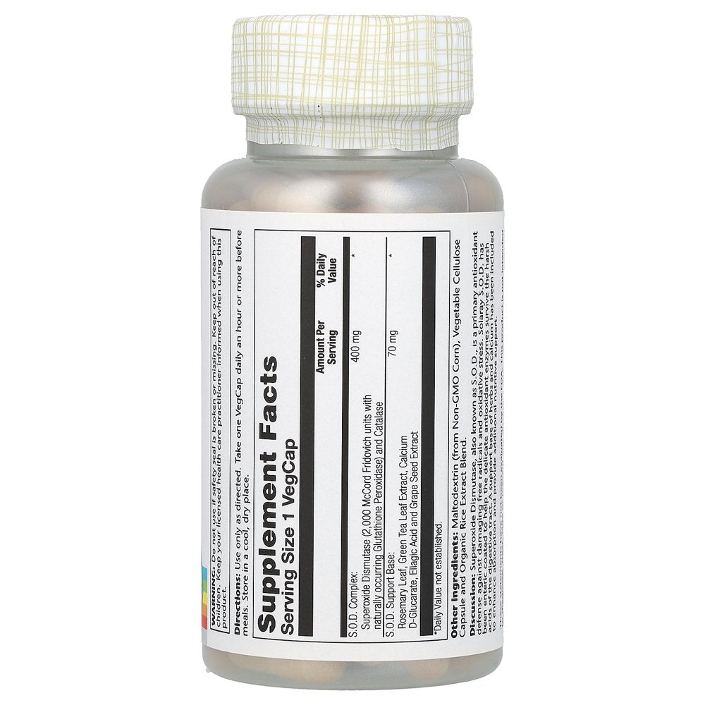 Solaray S.O.D. 2000 Plus 400mg complex provides 2000 McCord Fridovich Units of superoxide dismutase with naturally occurring glutathione peroxidase and catalase for powerful support. Our vegetarian capsules are enteric coated, which may help the delicate enzymes survive the harsh acids of the digestive tract for maximum absorption and utilization. We’ve also included a base of rosemary, green tea, calcium D-glucarate, ellagic acid and grape seed extract for added, hardworking support.