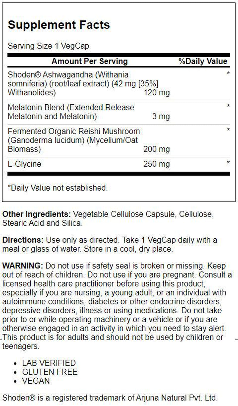 - Better Formula: 1 VegCap serving packed with 3mg Melatonin, 120 mg Shoden Ashwagandha, 200 mg Fermented Organic Reishi Mushroom and 250 mg L-Glycine. Vegan, Gluten Free and 100% PCR recycled plastic bottles.