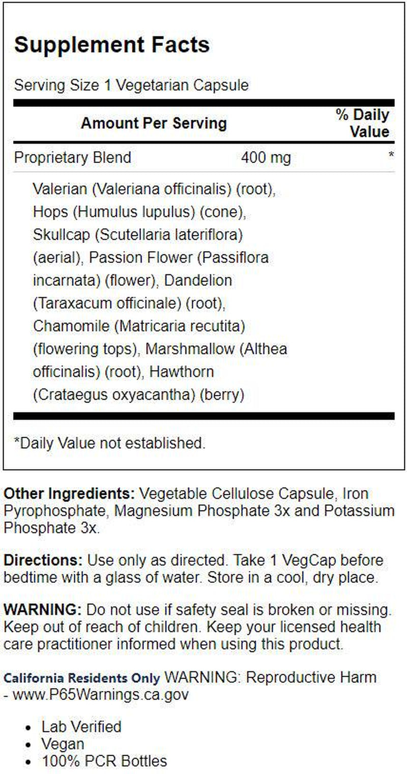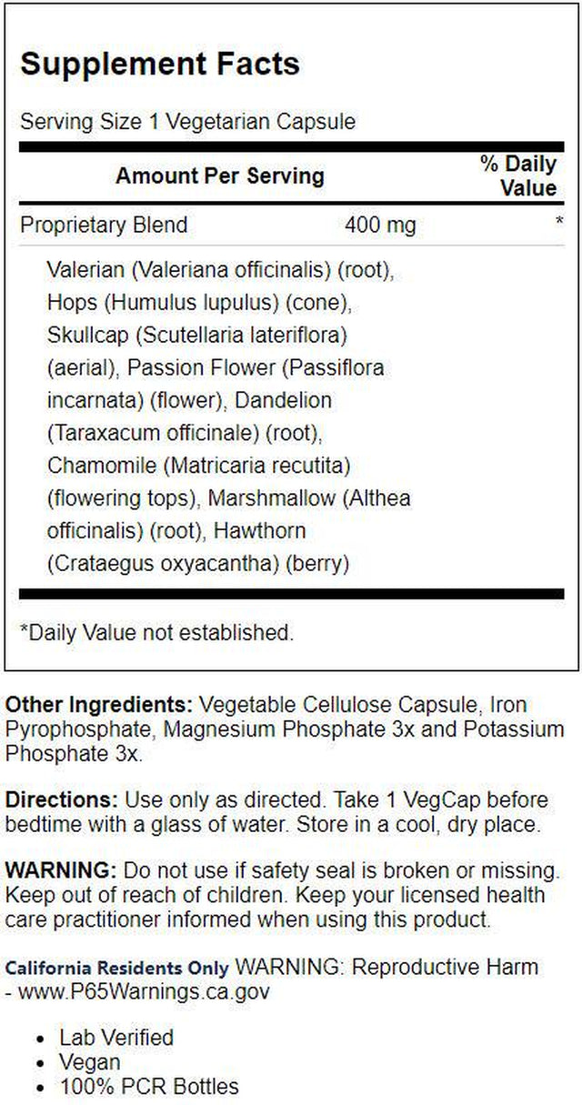 | Recommended Use | Use only as directed. Take one vegetarian capsule before bedtime with a glass of water. Store in a cool, dry place. |