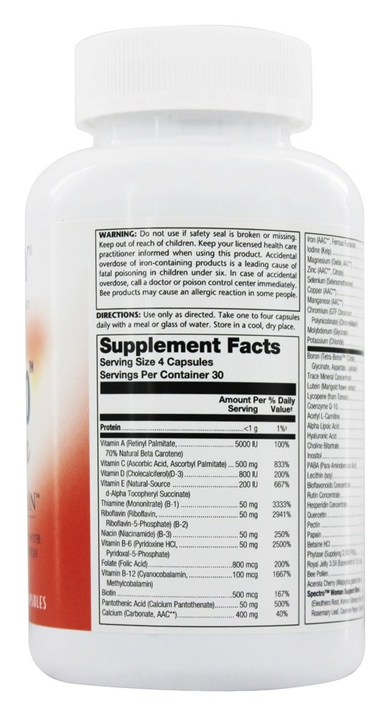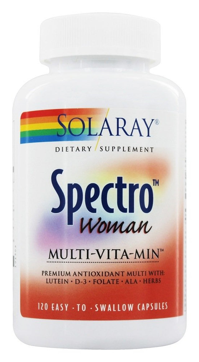 Solaray Spectro Woman Multi-Vita-Min Solaray Spectro Woman Multivitamin is an innovative antioxidant multiple designed to meet the needs of the active woman who wants a complete formula in an easy 4-daily dosage. Solaray Spectro Woman Multi-Vita-Min formula combines over 80 ingredients, including optimal amounts of coenzyme vitamins, full-spectrum chelated and trace minerals, enzymes and carotenoids. Solaray Spectro Woman Multi-Vita-Min also contains important antioxidants, energizing