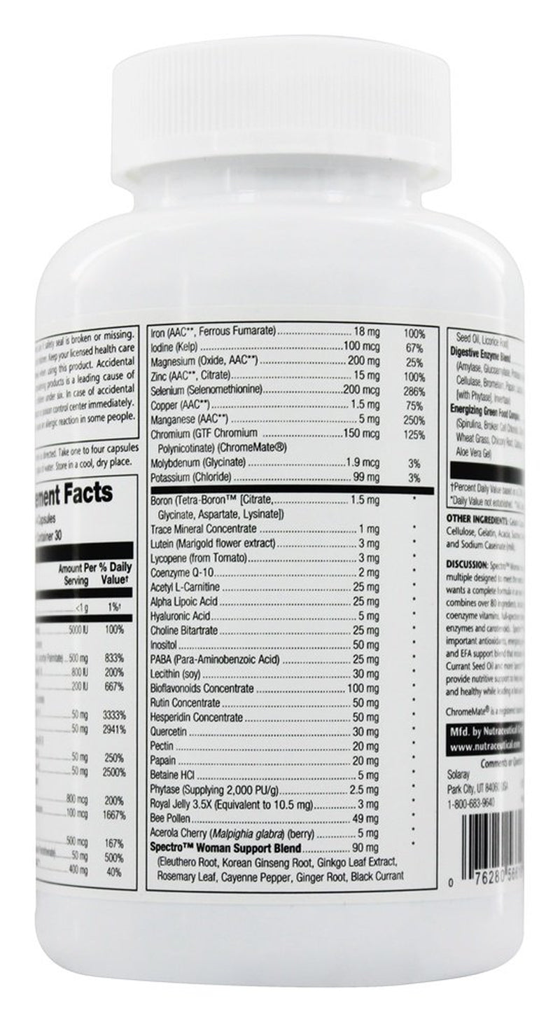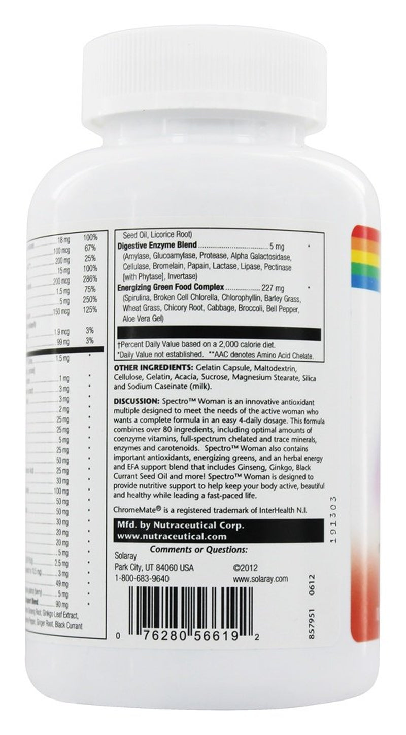 Solaray Spectro Woman Multivitamin is an innovative antioxidant multiple designed to meet the needs of the active woman who wants a complete formula in an easy 4-daily dosage. Solaray Spectro Woman Multi-Vita-Min formula combines over 80 ingredients, including optimal amounts of coenzyme vitamins, full-spectrum chelated and trace minerals, enzymes and carotenoids.