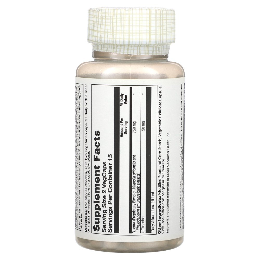Solaray Total Calm Relaxation Formula contains 750 mg of Relora® (proprietary blend of Magnolia officinalis and Phellodendron amurense bark extracts) mixed with 50 mg of L-Theanine. True Selection Solaray takes pride in offering great new products ... see here what we are delivering fresh to health food stores! No other brand offers a wider selection of vitamins, minerals, herbs and specialty products than Solaray.