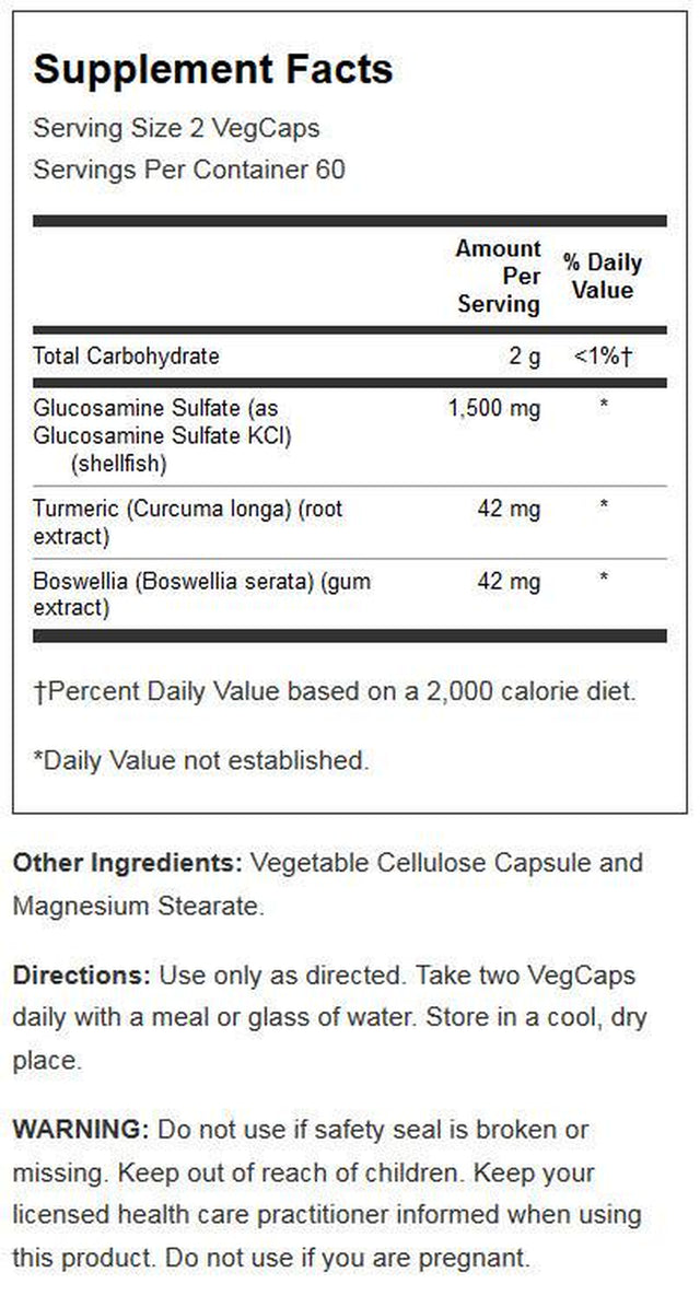 Promote healthy joints with Solaray Two Daily Glucosamine Sulfate. Glucosamine is a key component in the synthesis of connective tissues for overall joint mobility and comfort. Just 2 capsules daily of this targeted formula delivers 1,500 mg of glucosamine from shellfish. Turmeric and boswellia have also been added as an active support base.