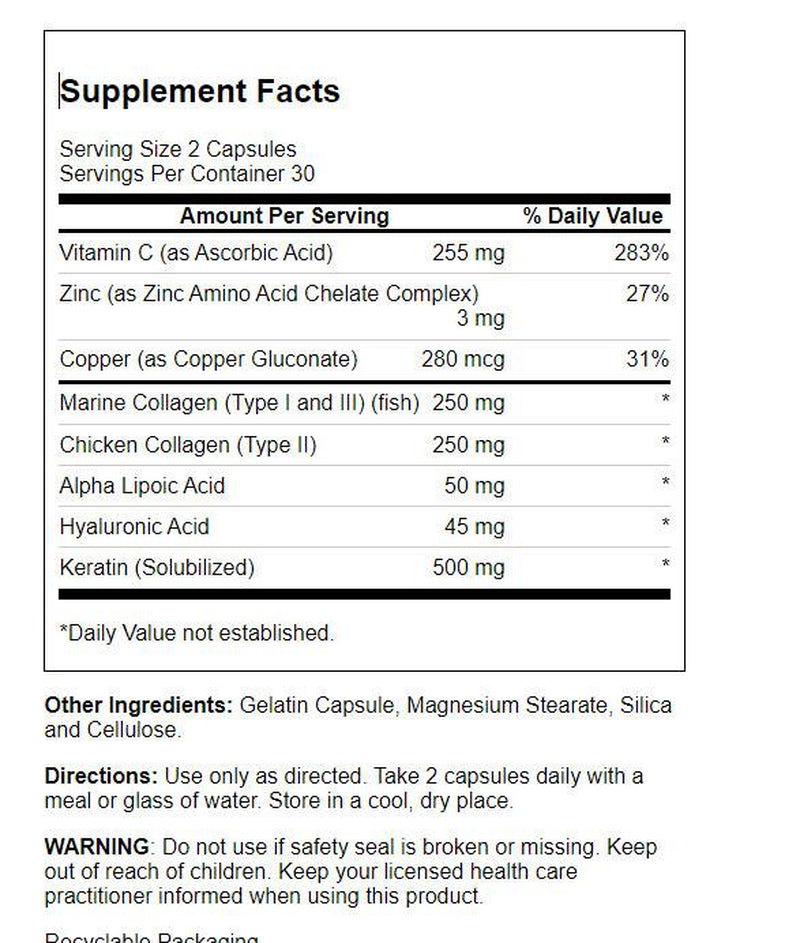 When you need head-to-toe powerful support, you need complementary companions collagen and keratin! Considered structural proteins, collagen is the most abundant protein found in the body, while keratin is a protective protein especially important for hair health. Solaray Collagen Keratin provides 500 mg of each (250 mg of Type I and III Marine Collagen and 250 mg of Type II Chicken Collagen) in every 2-capsule serving. Our formula also includes added vitamin C, zinc and copper, as well as alpha lipoic acid and hyaluronic acid, intended to help support healthy collagen synthesis, hair, skin, nails, joints, bones, muscles, and more! Like all Solaray products, Type I, II & III Collagen Keratin is lab verified for potency, purity, and identity. Confidence in the Solaray name is just one of the reasons we’ve been around so long and maintain our place as a leader in the industry. Unlike many other companies, we manufacture almost all our own products, which gives us the ability to thoroughly test and screen raw ingredients for the slightest amount of impurities and manage the production process to provide the best possible quality. Rest assured, only the purest formulas ever reach your cabinet.