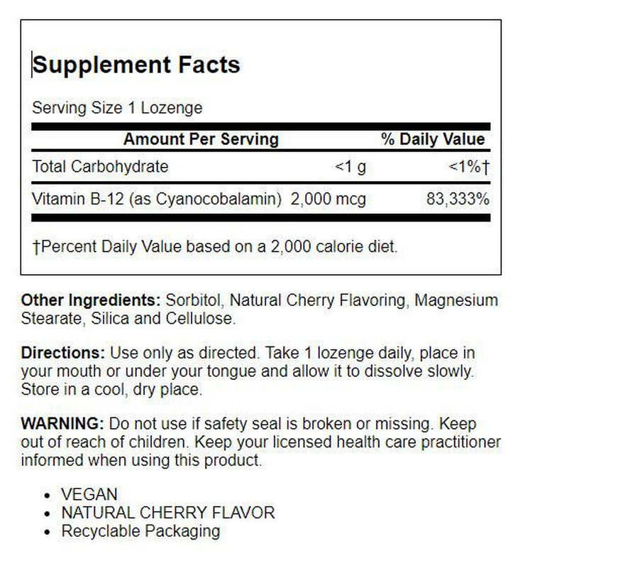- Power Packed: Each 1-lozenge serving provides 2000 mcg or 33,333% DV of B-12 as cyanocobalamin