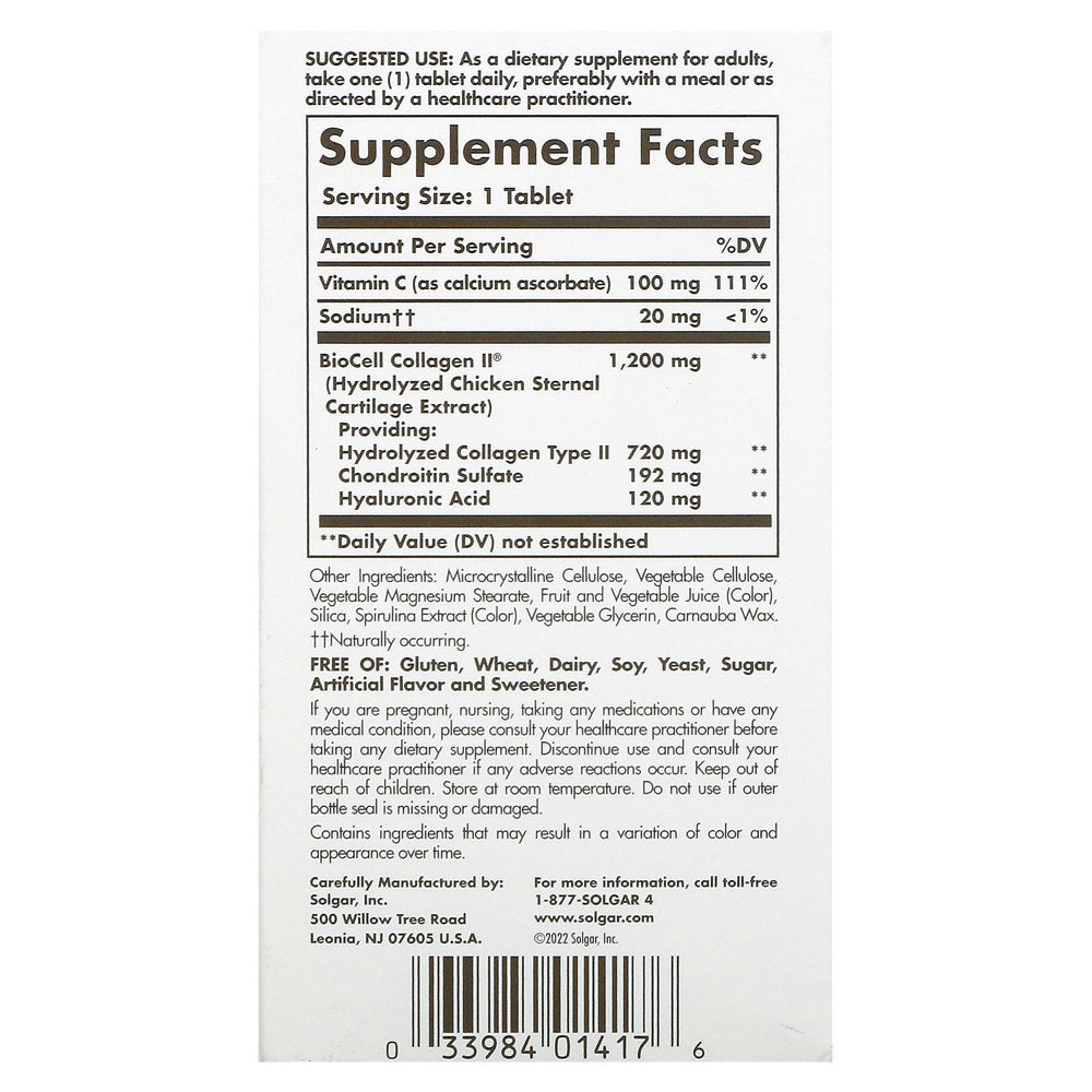 Nourishes Skin From Within Certified Gluten Free Gluten, Wheat & Dairy Free Non-GMO Dietary Supplement BioCell Collagen For beautiful results...go deep within your skin with Solgar® Collagen Hyaluronic Acid Complex. Helps With the Appearance of Facial Fine Lines and Wrinkles Significantly Increases Skin Elasticity Shown to Boost Skin Collagen After 12 Weeks† Helps Promotes Healthy Collagen Production Here's the inside story about Solgar® Collagen Hyaluronic Acid Complex: it nourishes your skin from within. The result is increased skin elasticity plus it helps with the appearance of facial fine lines and wrinkles. Contains BioCell Collagen II®, a clinically-studied ingredients composed of a matrix of collagen type II peptides, chondroitin sulfate, and hyaluronic acid. Plus Vitamin C which is involved in collagen formation and beneficial for the health of joints. Hormone and Antibiotic-Free Collagen Source Enhance your skin's appearance from within with Solgar® Collagen Hyaluronic Acid Complex. †Based on a human study where subject's skin collagen increased after 12 weeks of BioCell Collagen II® consumption.