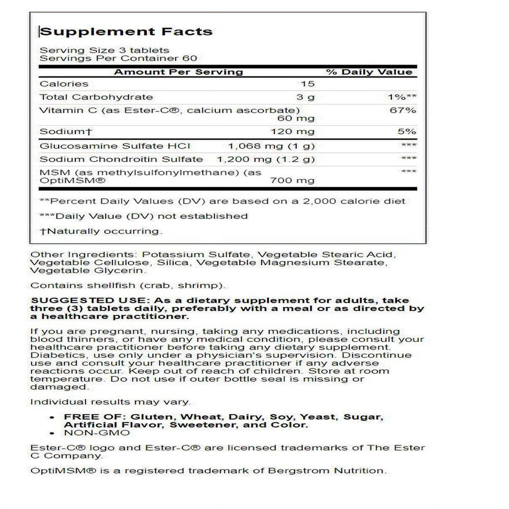Extra Strength Glucosamine Chondroitin MSM with Ester C 180 TabletProduct Description Solgar Extra Strength Glucosamine Chondroitin MSM with Ester-C Tablets are ideal for anyone requiring extra nutritional support for their cartilage and joints. This synergistic formula is specially designed to revitalize your joints and cartilage and will leave your joints feeling lubricated and rejuvenated. This formula will also help with occasional joint stress due to exercise or physical activity and supports joint health by helping to maintain enzymes necessary for collagen formation in their active state.*Suggested Use As a dietary supplement take three 3 tablets daily, preferably at mealtime, - Or as directed by your healthcare professional.Supplement FactsServing Size 3 Tablets Amount Per Serving% Daily Value***Vitamin C as Ester-C Calcium Ascorbate 60 mg 100% Sodium 90 mg 4% Glucosamine Sulfate from Shellfish 1500 mg ** Sodium Chondroitin Sulfate 1200 mg ** MSM as methylsulfonylmethane 700 mg ** ***Percent Daily Values are based on a 2,000 calorie dietOther Ingredients Vegetable Cellulose, Vegetable Stearic Acid, Silica, Vegetable Magnesium Stearate, Vegetable Glycerin. Contains Shellfish crab and shrimp .Does Not Contain FREE OF Gluten, Wheat, Dairy, Soy, Yeast, Sugar, Artificial Flavor, Sweetener, Preservatives and Color.Warnings Keep out of reach of children. As with all dietary supplements, consult your healthcare professional before use. See product label for more information. If you are pregnant, nursing, taking any medication or have a medical condition, please consult your healthcare practitioner before taking any dietary supplement. Diabetics, use only under a