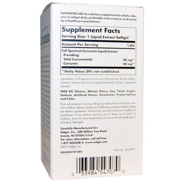 - FASTER ABSORPTION: For the first time, Solgar transforms poorly absorbed, fat-soluble curcumin to a water-soluble phytonutrient which makes it body-ready immediately. This allows the curcumin to be absorbed faster and more active than ever before, increasing its bioavailability to be 185 times better than everLONG LASTING: In addition to faster absorption, Solgar Full Spectrum Curcumin has been shown to be longer lasting. In fact it stays in your system for a full 24 hours, allowing for continuous support of brain, joint and immune healthOVERCOMING CHALLENGES: One challenge with curcumin is that there is a limit to how much your body is able to absorb and use. By increasing absorption, greater levels of active curcumin can be released across multiple pathways to support brain, joint and immune healthHOW IT’S DIFFERENT: Unlike regular curcumin powder, Solgar starts with 95% curcumin extract, which is the standardized active form, purified and concentrated from native turmeric root. It is the surrounded and encapsulated with microscopic, “water-loving” spheres called micelles which are so small that they allow curcumin to be readily passed into the bloodstream causing greater absorptionSuggested Use: As a dietary supplement for adults, take one (1) vegetable capsule daily, or as directed by a healthcare practitioner.