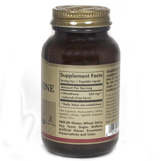 L-Glutathione 250mg 60 VegCapProduct DescriptionGlutathione is a sulfur-containing peptide made up of three amino acids Glutamic acid, Cysteine and Glycine. It is an important water-soluble antioxidant that plays a role in protecting the body from free radical oxidative stress, which can lead to premature aging of cells. It also acts in amino acid transport pathways.Suggested Use As a dietary supplement adults, take one 1 vegetable capsule up to two times daily, between meals - Or as directed by your healthcare professional.Supplement FactsServing Size 1 VegCap Servings Per Container 60 Amount Per Serving% Daily Value***L-Glutathione reduced Free Form 250 mg ***Percent Daily Values are based on a 2,000 calorie dietOther Ingredients Microcrystalline Cellulose, Vegetable Cellulose, Vegetable Magnesium Stearate, Silica.Does Not Contain Gluten, Wheat, Dairy, Soy, Yeast, Sugar, Sodium, Artificial Flavor, Sweetener, Preservatives and Color.Warnings Keep out of reach of children. As with all dietary supplements, consult your healthcare professional before use. See product label for more information.