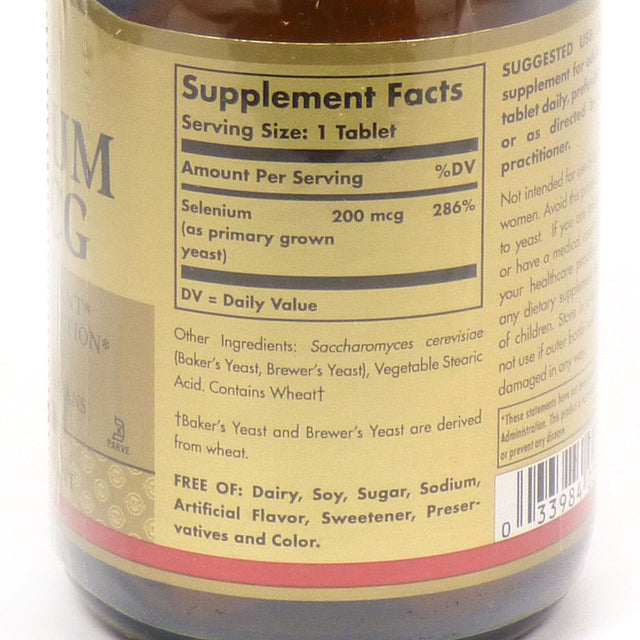 Selenium 200mcg 100 TabletProduct DescriptionSelenium is an essential trace mineral. It is a component of the powerful antioxidant enzyme glutathione peroxidase, which helps to fight cell-damaging free radicals. Selenium also helps recycle Vitamin E, which in turn helps promote cell protection. This formulation provides Selenium from primary grown yeast.Suggested Use As a dietary supplement take one 1 tablet daily, preferably at mealtime - Or as directed by your healthcare professional.Supplement FactsServing Size 1 Tablet Servings Per Container 100 Amount Per Serving% Daily Value***Selenium as primary grown yeast 200 mcg 286% ***Percent Daily Values are based on a 2,000 calorie dietOther Ingredients Saccharomyces cerevisiae Bakers Yeast, Brewers Yeast , Vegetable Stearic Acid. Contains Wheat Bakers Yeast and Brewers Yeast are derived from wheat Does Not Contain Dairy, Soy, Sugar, Sodium, Artificial Flavor, Sweetener, Preservatives and Color.Warnings Keep out of reach of children. As with all dietary supplements, consult your healthcare professional before use. See product label for more information.