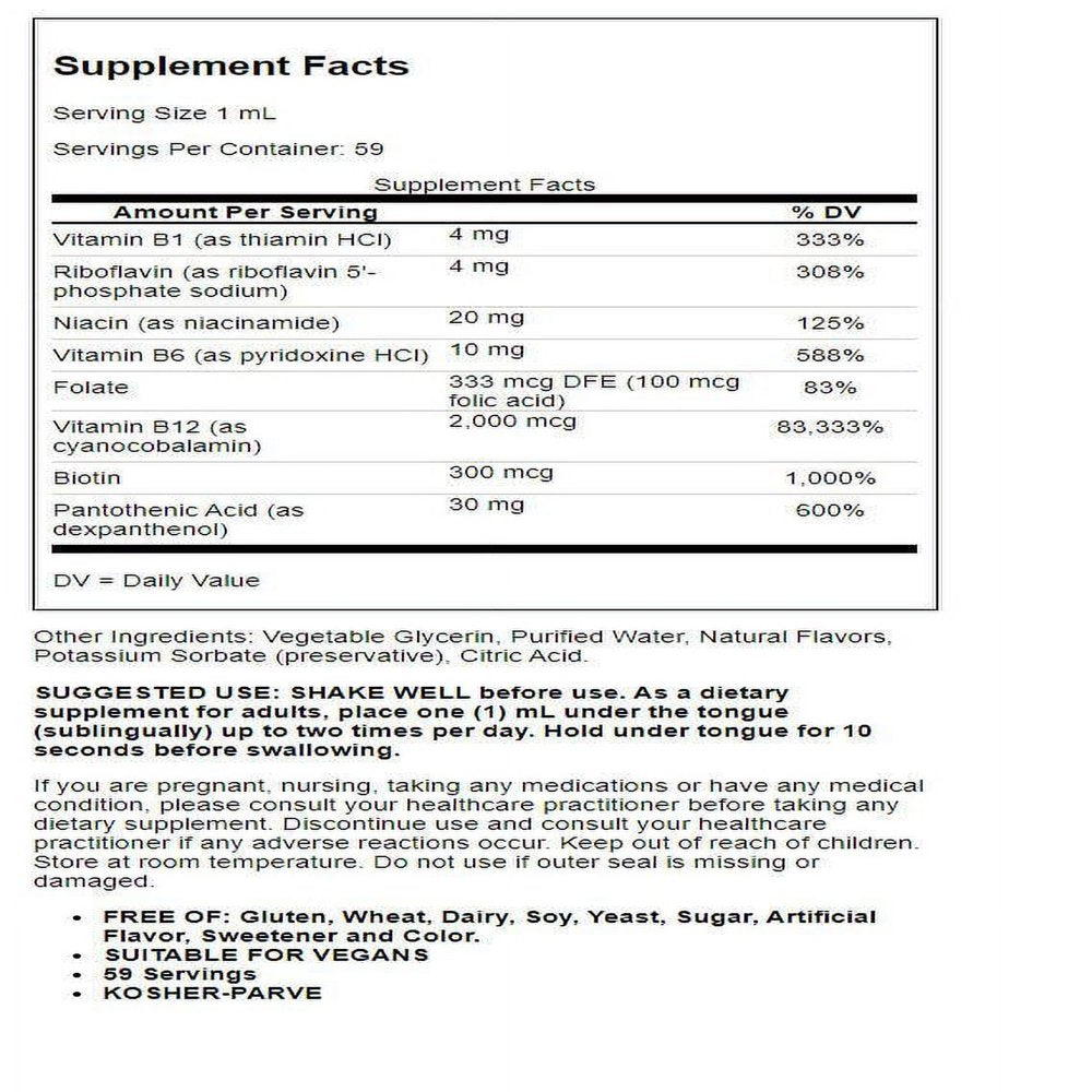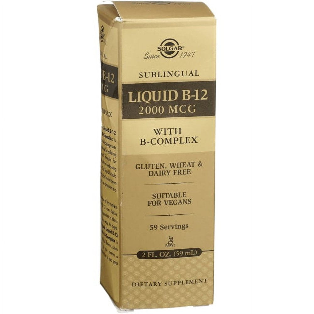 Liquid B-12 with B-Complex from Solgar features 2,000 mcg of vitamin B-12 in one dropper. This formula is designed for individuals who have trouble swallowing tablets or capsules. B-12 is a key nutrient throughout the aging process. Solgar's Liquid B-12 with B-Complex is free of gluten, wheat, dairy, soy, yeast, sugar, artificial flavor, sweetener and color, so you receive a pure vitamin supplement that is also great tasting. Suitable for vegans. Kosher. 59 servings.