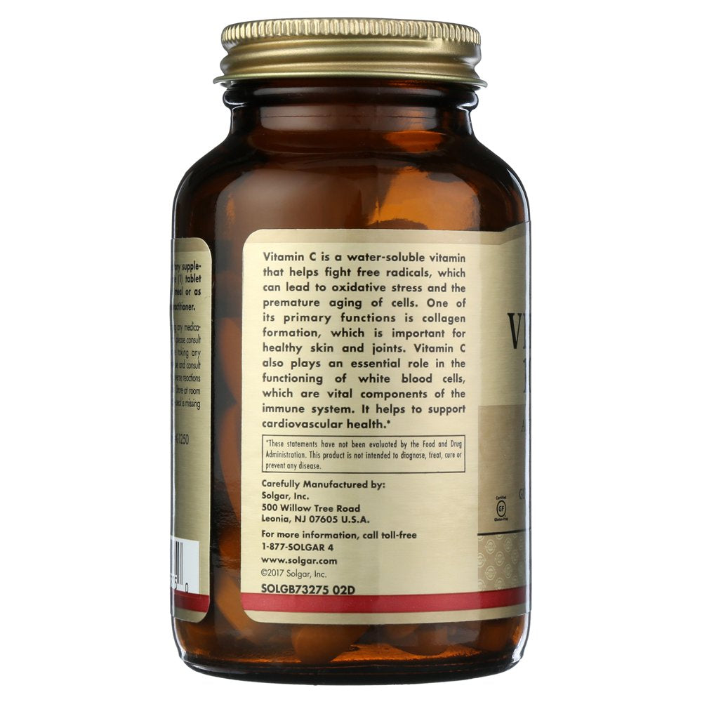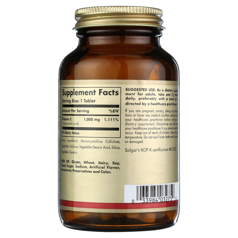 Product Description Solgar Vitamin C 1000 mg, 90 Tablets - Antioxidant & Immune Support, Overall Health, Healthy Skin & Joints - Bioflavonoids Supplement - Non-GMO, Vegan, Gluten Free, Kosher - 90 Servings Key Features Immune Support; Solgar Vitamin C 1000 mg helps support a healthy immune system; It also plays an essential role in the functioning of white blood cells which are vital components of the immune system Powerful Antioxidant; Vitamin C helps fight free radicals, which can lead to oxidative stress and the premature aging of cells Healthy Skin & Joints; One of the primary functions of Vitamin C is collagen formation, which is important for healthy skin and joints Non-GMO & Gluten Free; Solgar Vitamin C 1000 mg Tablets are non-GMO, kosher, and suitable for vegans; Free of: gluten, wheat, dairy, soy, yeast, sugar, sodium, artificial flavor and sweetener The Gold Standard: For over 70 years, Solgar has been committed to quality, health, and well-being. Our mission is to create the finest nutritional supplements in small batches, through tireless research, using only the finest raw materials