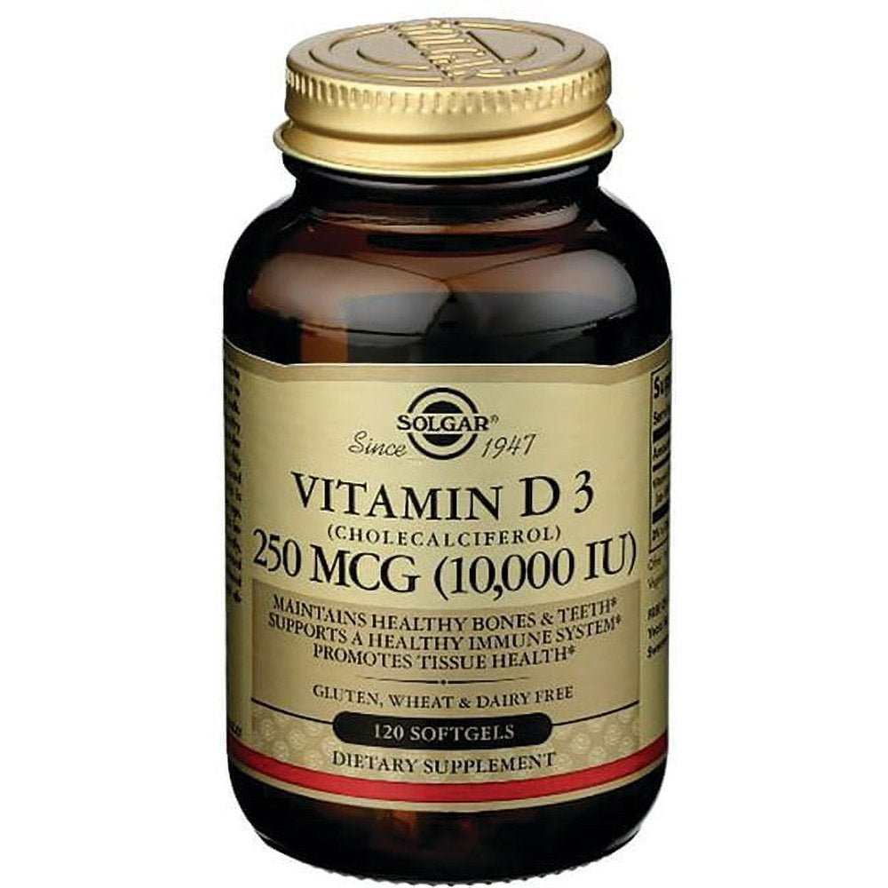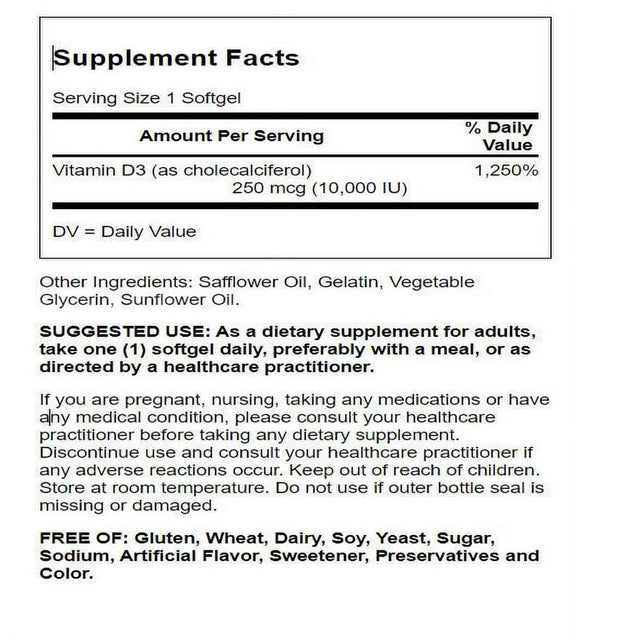 Serving Size 1 Softgel Servings Per Container 120 Amount Per Serving % Daily Value*** Vitamin D3 as cholecalciferol 10,000 IU 2500% ***Percent Daily Values are based on a 2,000 calorie diet Other Ingredients Safflower Oil, Gelatin, Vegetable Glycerin. Does not contain Gluten, Wheat, Dairy, Soy, Yeast, Sugar, Sodium, Artificial Flavor, Sweetener, Preservatives and Color. Warnings Keep out of reach of children. As with all dietary supplements, consult your healthcare professional before use. See product label for more information. If you are pregnant, nursing, taking any medication or have a medical condition, please consult your healthcare practitioner before taking any dietary supplement. Store in a cool, dry place. Do not use if outer bottle seal is missing, torn or damaged in any way.Solgar - Vitamin D3 (Cholecalciferol) 10,000 IU - 120 Softgels Solgar VItamin D3 (Cholecalciferol) 10000 IU is a gluten, wheat and dairy free dietary supplement. Vitamin D is required to promote calcium absorption, which helps to maintain healthy bones and teeth. Vitamin D also supports a healthy immune system, the health of the pancreas and supports the health of various tissues including breast and colon tissue. It may also support neuromuscular function in older adults. The natural Vitamin